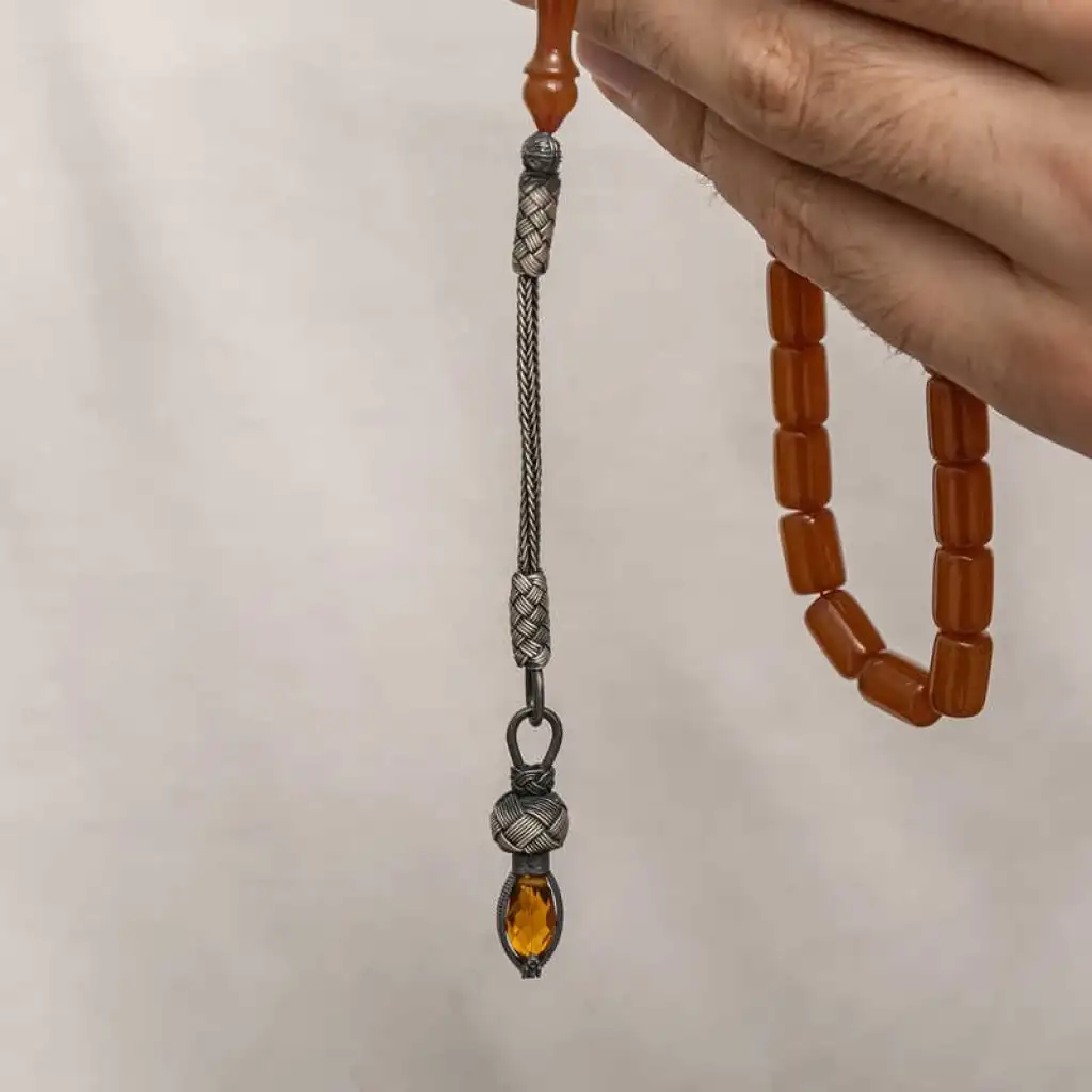 Gümüş 1000 Ayar Kazaz Püsküllü Sıkma Kehribar Tesbih