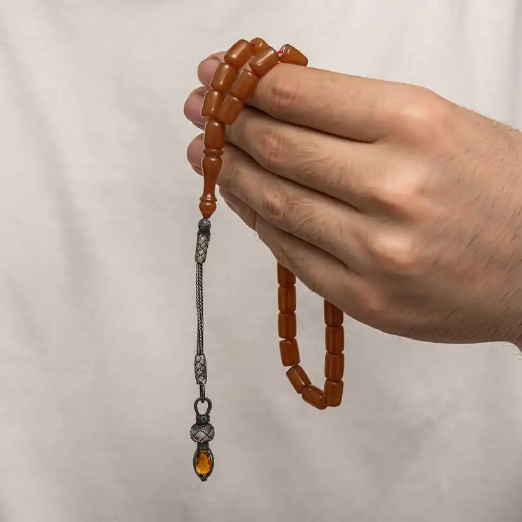 Kehribar, çam ağacı reçinesinin toprak altında uzun yıllar boyunca birikerek oluşan bir maddedir. Hemen hemen taş ile aynı sertliktedir fakat yoğunluğu düşüktür. Çam kokusu yayar. Oluşumu uzun zaman aldığından ve yapay olarak yapılamadığından değerli bir maddedir. Sıkma kehribar ise kehribar taşından farklı olarak onun özelliklerini taşıyan, görüntü itibariyle ona benzeyen fakat gerçek olmayan bir malzemedir. Ülkemizde ve dünyanın bir çok yerinde kehribar taşından çeşitli malzemeler üretilmiştir. Ülkemizde en yaygın olarak tesbih üretilmektedir. Kehribar tesbihler elde ısındıkça kehribar benzeri bir koku verir ve renk değiştirir. Bir çok rengi vardır. Hatta iki rengin birleşiminden oluşan kehribar tesbih modelleri de vardır. Genellikle gümüş püskül ile kullanılır veya sistemli olarak da kullanılabilir. Ülkemizin güzide tesbih ustaları bu malzemeyi sıklıkla işlemek suretiyle çeşitli sanat eserleri meydana getirirler. Bu tesbihler de koleksiyonerler tarafından alınıp satılmaktadır. Gümüş 1000 ayar kazaz püsküllü sıkma kehribar tesbih modeli de günlük hayatta kullanılabilecek çok şık bir tesbih çeşididir. Özel günlerin vazgeçilmez hediyesi sıkma kehribar tesbihler erkekler için doğum günü, sevgililer günü ve babalar günü gibi özel zamanlarda hediye olarak tercih edilebilir. Gümüş kazaz püsküllü sıkma kehribar tesbih modeli diğer kehribar tesbih modellerinde olduğu gibi tamamen el emeği ile imal edilmiştir.