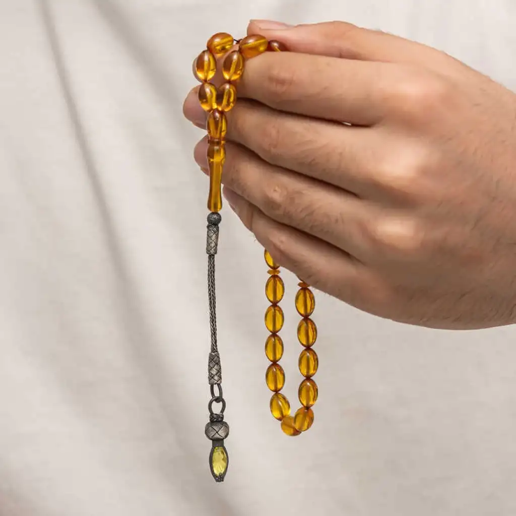 Kehribar, çam ağacı reçinesinin toprak altında uzun yıllar boyunca birikerek oluşan bir maddedir. Hemen hemen taş ile aynı sertliktedir fakat yoğunluğu düşüktür. Çam kokusu yayar. Oluşumu uzun zaman aldığından ve yapay olarak yapılamadığından değerli bir maddedir. Sıkma kehribar ise kehribar taşından farklı olarak onun özelliklerini taşıyan, görüntü itibariyle ona benzeyen fakat gerçek olmayan bir malzemedir. Ülkemizde ve dünyanın bir çok yerinde kehribar taşından çeşitli malzemeler üretilmiştir. Ülkemizde en yaygın olarak tesbih üretilmektedir. Kehribar tesbihler elde ısındıkça kehribar benzeri bir koku verir ve renk değiştirir. Bir çok rengi vardır. Hatta iki rengin birleşiminden oluşan kehribar tesbih modelleri de vardır. Genellikle gümüş püskül ile kullanılır veya sistemli olarak da kullanılabilir. Ülkemizin güzide tesbih ustaları bu malzemeyi sıklıkla işlemek suretiyle çeşitli sanat eserleri meydana getirirler. Bu tesbihler de koleksiyonerler tarafından alınıp satılmaktadır. Gümüş 1000 ayar kazaz püsküllü sıkma kehribar tesbih modeli de günlük hayatta kullanılabilecek çok şık bir tesbih çeşididir. Özel günlerin vazgeçilmez hediyesi sıkma kehribar tesbihler erkekler için doğum günü, sevgililer günü ve babalar günü gibi özel zamanlarda hediye olarak tercih edilebilir. Gümüş kazaz püsküllü sıkma kehribar tesbih modeli diğer kehribar tesbih modellerinde olduğu gibi tamamen el emeği ile imal edilmiştir.