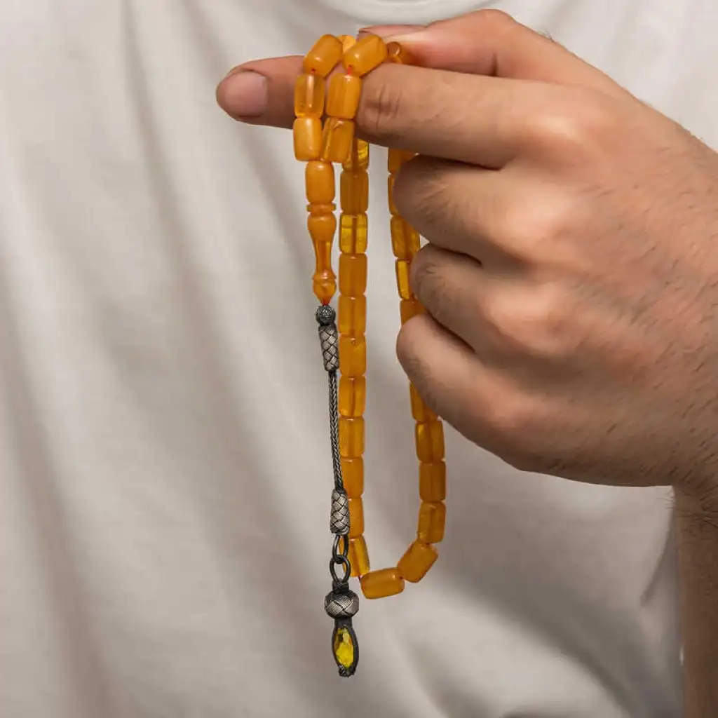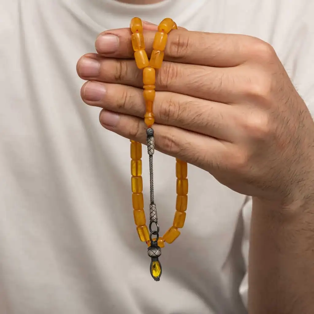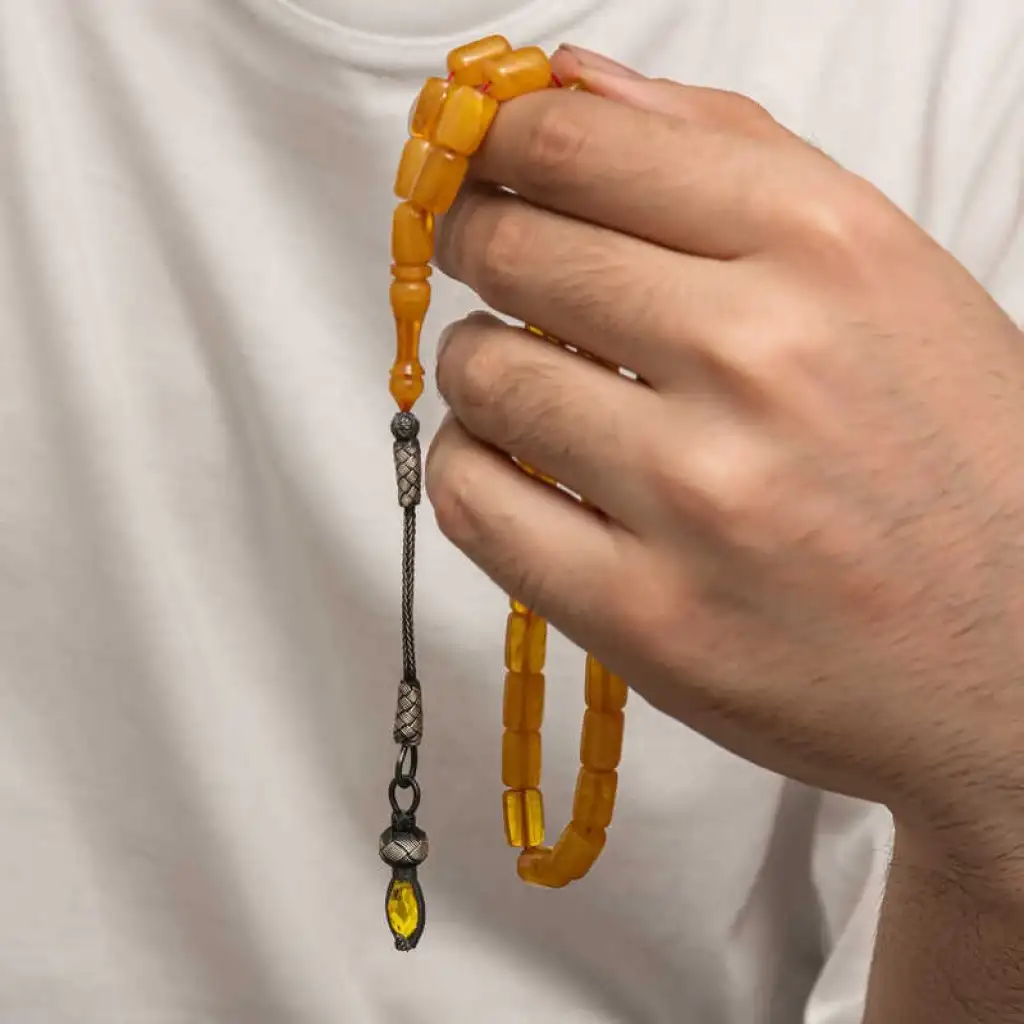 Kehribar, çam ağacı reçinesinin toprak altında uzun yıllar boyunca birikerek oluşan bir maddedir. Hemen hemen taş ile aynı sertliktedir fakat yoğunluğu düşüktür. Çam kokusu yayar. Oluşumu uzun zaman aldığından ve yapay olarak yapılamadığından değerli bir maddedir. Sıkma kehribar ise kehribar taşından farklı olarak onun özelliklerini taşıyan, görüntü itibariyle ona benzeyen fakat gerçek olmayan bir malzemedir. Ülkemizde ve dünyanın bir çok yerinde kehribar taşından çeşitli malzemeler üretilmiştir. Ülkemizde en yaygın olarak tesbih üretilmektedir. Kehribar tesbihler elde ısındıkça kehribar benzeri bir koku verir ve renk değiştirir. Bir çok rengi vardır. Hatta iki rengin birleşiminden oluşan kehribar tesbih modelleri de vardır. Genellikle gümüş püskül ile kullanılır veya sistemli olarak da kullanılabilir. Ülkemizin güzide tesbih ustaları bu malzemeyi sıklıkla işlemek suretiyle çeşitli sanat eserleri meydana getirirler. Bu tesbihler de koleksiyonerler tarafından alınıp satılmaktadır. Gümüş 1000 ayar kazaz püsküllü sıkma kehribar tesbih modeli de günlük hayatta kullanılabilecek çok şık bir tesbih çeşididir. Özel günlerin vazgeçilmez hediyesi sıkma kehribar tesbihler erkekler için doğum günü, sevgililer günü ve babalar günü gibi özel zamanlarda hediye olarak tercih edilebilir. Gümüş kazaz püsküllü sıkma kehribar tesbih modeli diğer kehribar tesbih modellerinde olduğu gibi tamamen el emeği ile imal edilmiştir.
