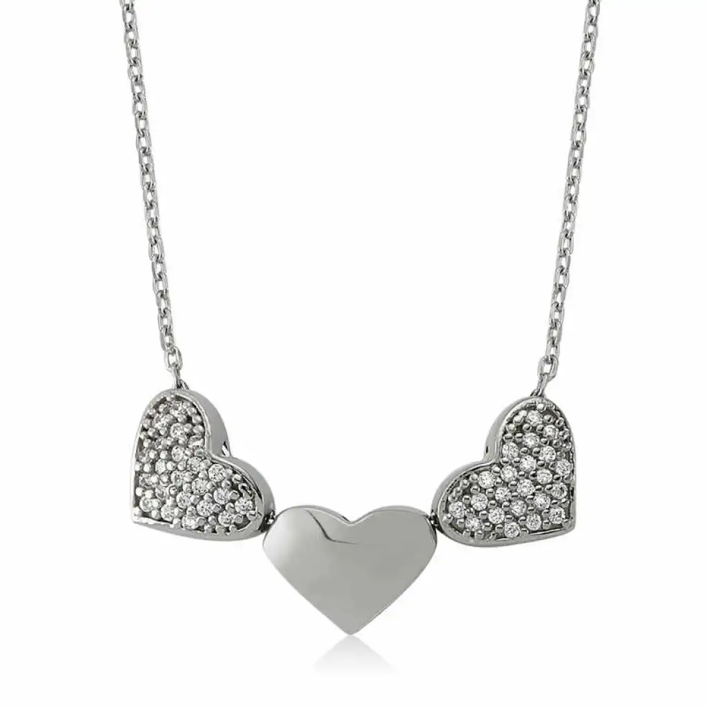Kalp deseniyle aşkı ifade eden gümüş üç kalpli bayan kolye ile sevginiz, sevdiğiniz kadının teninde hayat bulsun. Genç sevgililerin özel günlerde seçebileceği üç kalpli bayan kolye modeli ile sevdiğinizin boynunu aşkla süsleyin. Sizin olduğu kadar sevdiklerinizin de keyifle takacağı bu kolye en güzel hediyelerden biri olacaktır. Üç kalpli bayan kolye 925 ayar gümüşten imal edilmiştir. Gümüş üzerine rodyum kaplama yapılmıştır. Rodyum kaplama yapılan gümüş bayan kolye modelleri parlaklığını uzun süre muhafaza eder ve oksitlenmesi gecikir. Kolye üzerinde bulunan taşlar zirkondur. Gümüş olan zincir boyu ortalama 45 cm'dir. Tüm bayan kolye modellerinde olduğu gibi gümüş üç kalpli bayan kolye modeli de el emeği ile üretilmiştir. Gümüş ve değerli taşlar nedeniyle belirtilen ürün ağırlığında ± %10 sapma olabilmektedir.