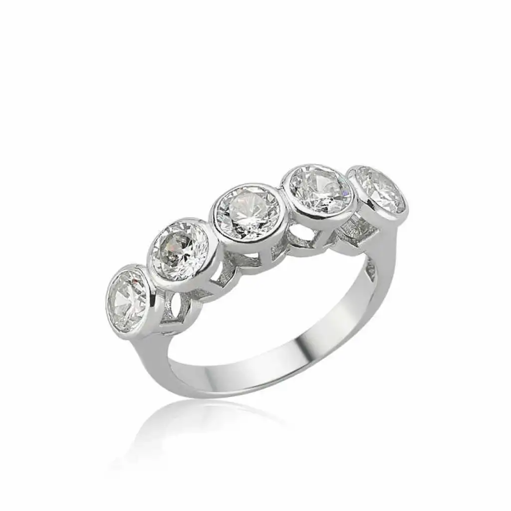 Beş taş yüzükler oldukça gösterişli ve asil takılardır. Çok taşlı alyanslar arasında en çok tercih edilen modellerden biridir. Her bir taşının anlamı vardır. Genelde aşk, sadakat, huzur, mutluluk ve bereketi temsil ederler. İlişkinizin beşinci yılı için biçilmiş bir kaftandır. Evilik veya tanışma yıldönümü, sevgililer günü, doğum günü gibi özel günler için en uygun hediyeyi arayanlar ve beş taş yüzük zarafetini yaşamak isteyenler için eşsiz modeller sizi bekliyor. Beş taş bayan yüzük modeli 925 ayar gümüşten imal edilmiştir. Gümüş üzerine rodyum kaplama yapılmıştır. Rodyum kaplama yapılan gümüş beş taş yüzük modelleri parlaklığını uzun süre muhafaza eder ve oksitlenmesi gecikir. Yüzük üzerinde bulunan beyaz taşlar zirkondur. Gümüş bayan yüzük modellerinin tamamında olduğu gibi gümüş beş taş bayan yüzük modeli de el emeği ile üretilmiştir. Gümüş ve değerli taşlar nedeniyle belirtilen ortalama ürün ağırlığında ± %10 sapma olabilmektedir.