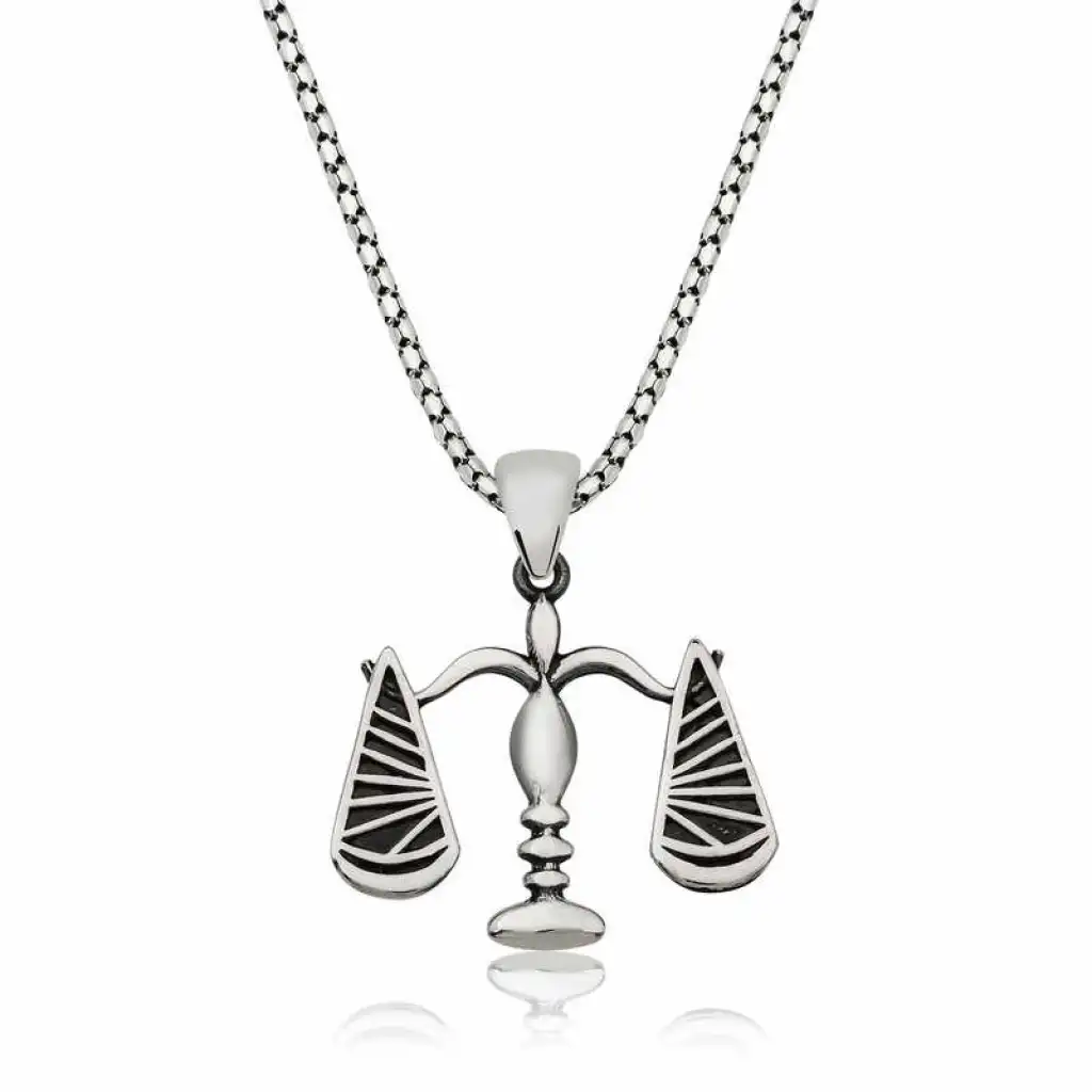“Terazi” adaleti ve hakların dengeli şekilde dağıtılmasını sembolize eder. Adalet terazisi kolye; 925 ayar gümüşten imal edilmiştir. Gümüş üzerine oksit kaplama yapılmıştır. Oksit kaplama gümüşe eskitme görüntüsü verir. Zincir uzunluğu ortalama 55 cm'dr. Tüm kolyelerde olduğu gibi bu gümüş adalet terazisi kolye modeli de tamamen el emeği ile üretilmiştir.