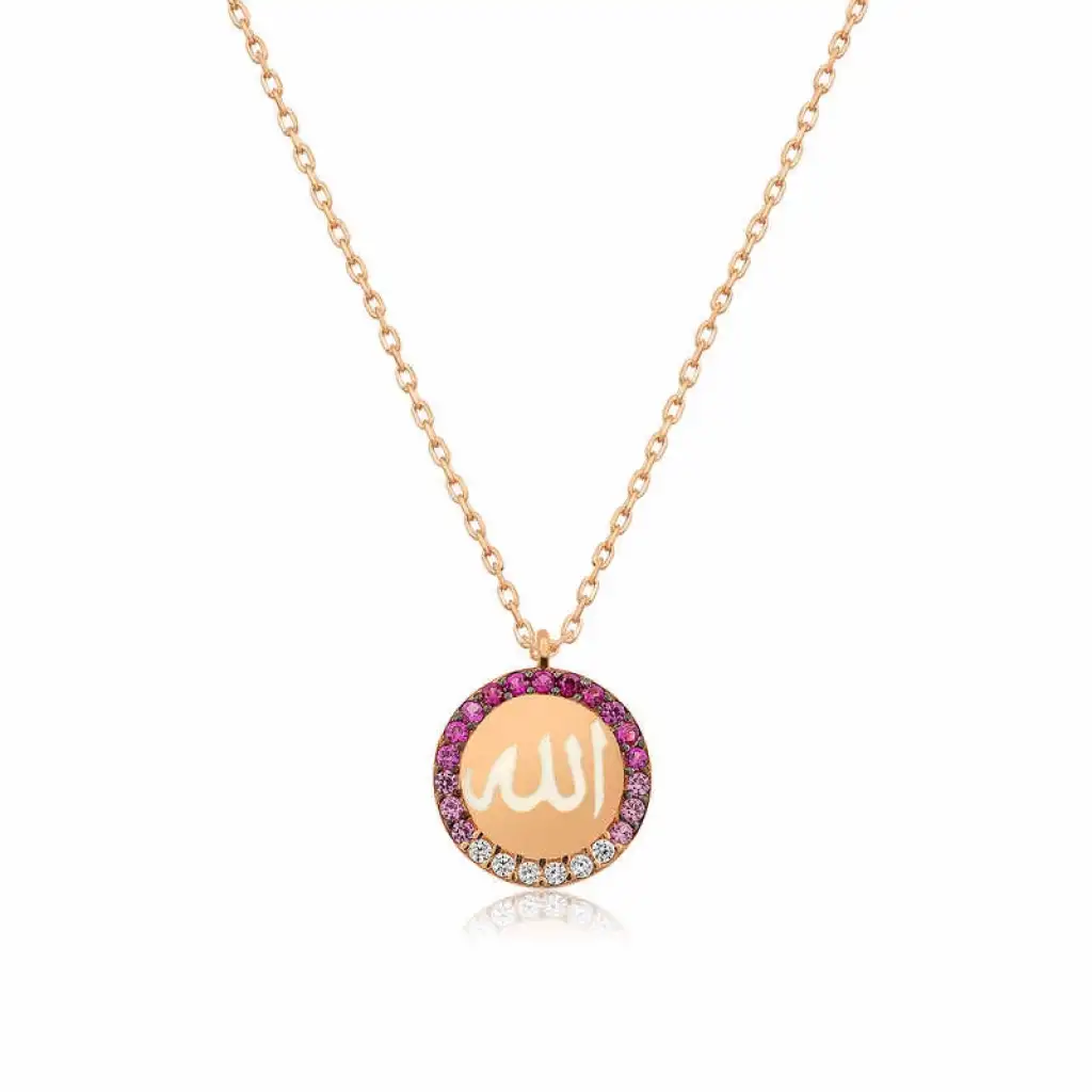 99 güzel isminden birincisi olan Allah yazılı kolyemiz ile göz alıcı şıklığınızı tamamlayın. Bu güzel kolye modelimiz 925 ayar gümüşten imal edilmiştir. Gümüş üzerine rose kaplama yapılmıştır.Rose kaplama yapılan gümüş bayan kolye modellerimiz parlaklığını uzun süre muhafaza eder, oksitlenmesi gecikir. Bu Allah yazılı kolyenin zincir uzunluğu ortalama 45 cm’dir. Tüm bayan kolye modellerimizde olduğu gibi Allah yazılı gümüş bayan kolye de el emeği ile üretilmiştir ve değerli taşlar nedeniyle ürün ağırlığında ± %10 sapma olabilmektedir.