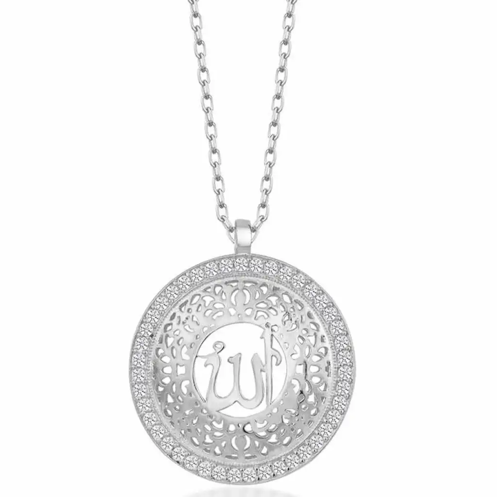 99 güzel isminden birincisi olan Allah yazılı kolyemiz ile göz alıcı şıklığınızı tamamlayın. Bu güzel kolye modelimiz 925 ayar gümüşten imal edilmiştir. Gümüş üzerine rodyum kaplama yapılmıştır. Rodyum kaplama yapılan gümüş kadın kolye modellerimiz parlaklığını uzun süre muhafaza eder, oksitlenmesi gecikir. Bu Allah yazılı kolyenin zincir uzunluğu ortalama 45 cm’dir. Tüm kadın kolye modellerimizde olduğu gibi Allah yazılı gümüş kadın kolye de el emeği ile üretilmiştir ve değerli taşlar nedeniyle ürün ağırlığında ± %10 sapma olabilmektedir.
