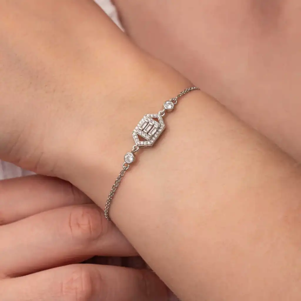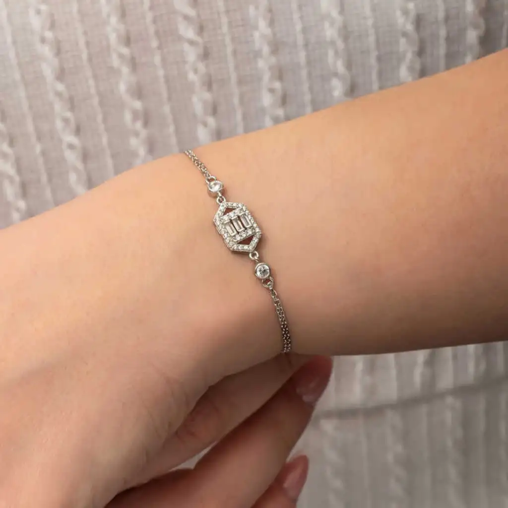 Gümüş Altıgen Baget Taşlı Kadın Bileklik