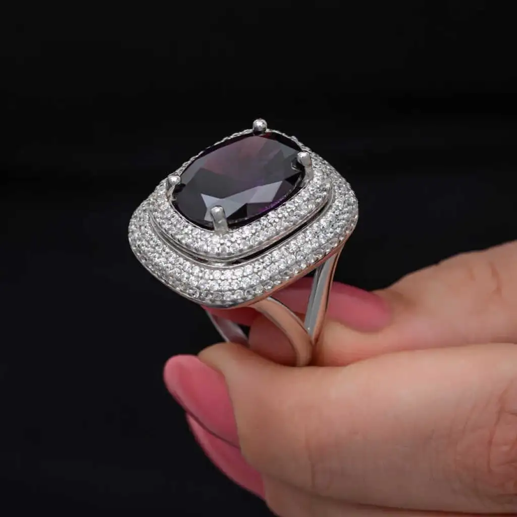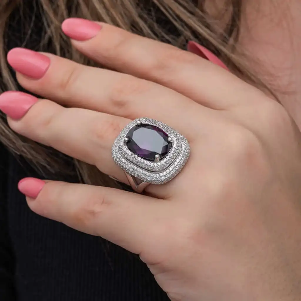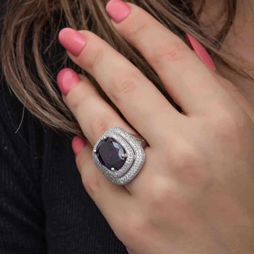 Asırlar boyunca birçok medeniyet tarafından kullanılmış ve günümüze kadar değerini korumuş olan Ametist, hemen her dönem en gözde değerli taşlardan biri olmuştur. Çeşitli kültürlerde “mor yakut”, “mor necef” adlarıyla, kimi zaman da “aşk taşı” olarak tanımlanmıştır. Ametist taşı; tüm değerli taşlar gibi takı, süs ve ziynet eşyalarının yapımında ve oymacılıkta kullanılmaktadır. Takı ve mücevheratta, özellikle şifa ve pozitif enerji verdiğine inanılan koyu mor Ametist öne çıkar. Sadece beden ile temasında değil, taşın bulunduğu ortama yaydığı pozitif enerji de büyük rağbet görmesinde etkilidir. Yüzyıllardır imajınızın simgesi olan takılar, birbirinden özel tasarım koleksiyonlarda sizlerle buluşuyor. Günlük hayatınızdan özel günlerinize kadar her anınızda yanınızda olan gümüş yüzük modelleriyle sizlerde tarzınızı yansıtın. Bu birbirinden farklı dikkat çekici tasarımlar sayesinde ruhunuza hitap eden yaratıcı özgünlüğü ortaya koymaya başlayın. Hayalinizdeki kombinleri gerçeğe dönüştürebileceğiniz gümüş yüzük çeşitleri ile girdiğiniz her ortamda ilgi çekici stiliniz ile ön plana çıkmak artık çok kolay... Ametist taşlı kadın yüzük 925 ayar gümüşten imal edilmiştir, üzerine rodyum kaplama yapılmıştır. Gümüş yüzük modellerimizin tamamı el emeği ile üretilmiştir. Gümüş ve değerli taşlar nedeniyle belirtilen ortalama ürün ağırlığında ± %10 sapma olabilmektedir.