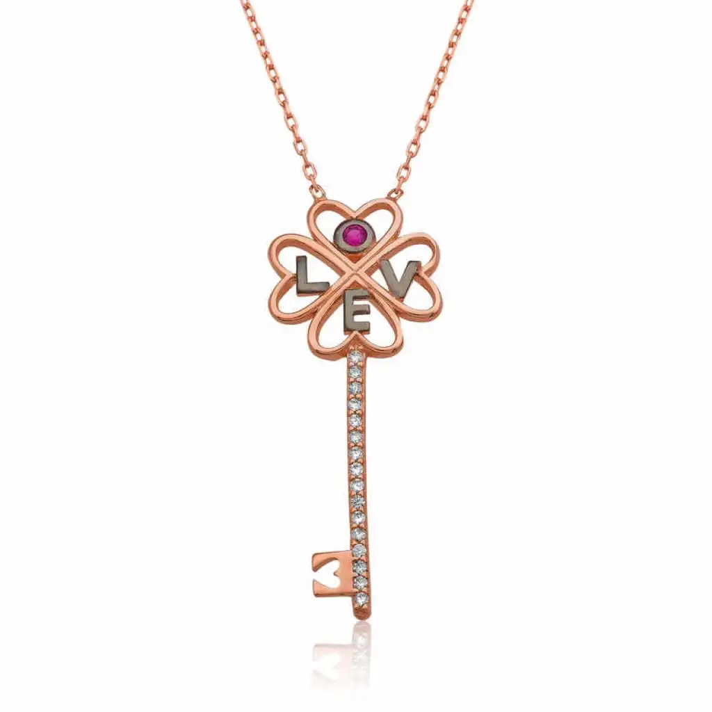 Anahtar sembolik bir anlama sahiptir, sevdiğiniz kişiye kalbinizin anahtarını verdiğiniz anlamına gelmektedir. Sevgililer günü, yıl dönümü veya sevgilinizin doğum gününde iyi bir hediye arıyorsanız bu şık kolye modeli tam size göre... Aksesuar olarak son derece şık bir tasarıma sahip olan bu kolye dilerseniz günlük hayatta dilerseniz, davetlerde kullanabileceğiniz her kıyafetinize uyacak oldukça başarılı bir tasarımdır. Gümüş üzerinde rose altın kaplama yapılmıştır. Rose altın kaplama gümüşe pembe rengini verir ve oksitlenmesini geciktirir. Sevdiklerine eşsiz bir hediye vermek isteyen kişiler için kaçırılmayacak bir fırsatdır. Ürünlerimizin tamamı el emeği ile üretilmiştir. Gümüş ve değerli taşlar nedeniyle belirtilen ortalama ürün ağırlığında ± %10 sapma olabilmektedir.