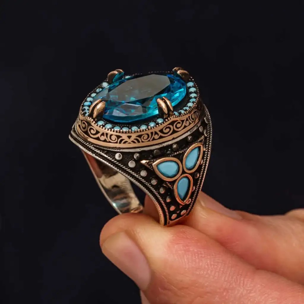 Gümüş Aquamarine Taşlı Erkek Yüzük