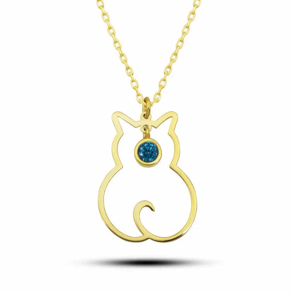 Her bir doğum taşı, belli bir ayla özdeşleşmiştir. Turkuaz aralık ayının burç taşıdır. Rengi mavi-yeşildir. Şans taşı olarak bilinen turkuazın bir diğer ismi de firuze taşıdır. Nazara karşı iyi geldiğine inanılan taş eşsiz rengi nedeniyle oldukça binlerce yıldır takı ve süs eşyası olarak kullanılmaktadır. Bilinci geliştirdiğine inanılan taşın tansiyona ve kalp hastalıklarına iyi geldiği söylenmektedir. Ayrıca konuşma ve yazı yoluyla ifade gücünü arttırdığına inanılmaktadır. Evlerimizin sevimli neşe kaynağı kediler, temiz olmalarının yanı sıra masumiyetin simgesidir. Asil ve mantıklı bir kişiliğe, mükemmel sezgilere ve akılcı bir duyarlılığa sahiptirler. Özel günlerin en tercih edilen hediye seçeneklerinden olan gümüş takılar, sevdiklerini mutlu etmek ve onlara her an yanlarında taşıyabilecekleri bir hediye vermek isteyenler için tasarlandı. Masumiyetin simgesi olan kedi figürlü gümüş kolye modelini kız kardeşinize, sevgilinize ya da arkadaşlarınıza armağan edebilirsiniz. Turkuaz taşlı kedi kadın kolye modeli 925 ayar gümüşten imal edilmiştir. Gümüş üzerine gold kaplama yapılmıştır. Gold kaplama yapılan gümüş kedi kolye modelleri parlaklığını uzun süre muhafaza eder ve oksitlenmesi gecikir. Kolye üzerinde bulunan tüm taş turkuazdır. Gümüş olan zincir boyu ortalama 45 cm'dir. Gümüş kadın kedi kolye diğer tüm gümüş kadın kolye modellerinde olduğu gibi el emeği ile üretilmiştir. Gümüş ve değerli taşlar nedeniyle belirtilen ortalama ürün ağırlığında ± %10 sapma olabilmektedir.