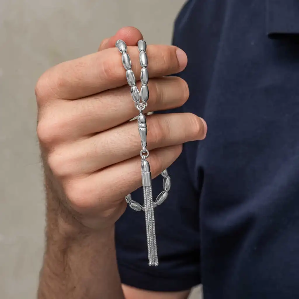 Erkekler için özel olarak tasarlanmış bu Gümüş Arpa Kesim Tesbih,zarif ve şık duruşuyla dikkat çeker.Tesbihin her bir tanesi,925 ayar gümüşten üretilmiş olup,arpa kesim formuyla klasik tesbih modellerine modern bir dokunuş katmaktadır.Arpa kesim taneler,hem estetik bir görünüm hem de elde kolayca çekim yapılmasını sağlar.Ucu püsküllü tasarım ise tesbihe otantik bir hava katarak hem günlük kullanım hem de hediye alternatifi olarak ideal bir tercih sunar.Gümüş tesbihi severek kullanabilir;doğum günü,sevgililer günü veya babalar gününde ya da özel günlerde hediye olarak tercih edebilirsiniz.Ürünlerimizin tamamı el emeği ile üretilmiştir.Gümüş ve değerli taşlar nedeniyle belirtilen ortalama ürün ağırlığında ± %10 sapma olabilmektedir.