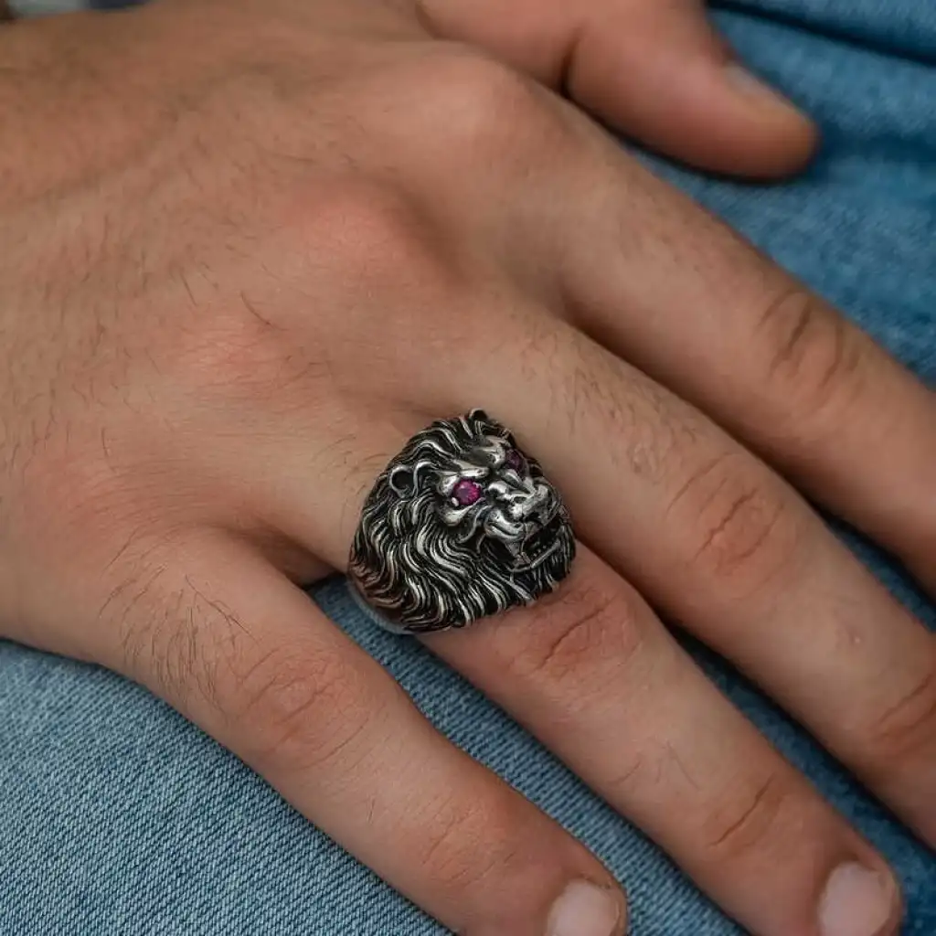 Aslan, hayvanlar aleminde ormanların kralı olarak bilinir. Aslan demek lider demektir. Erkek aslanın başının etrafı uzun ve güzel bir yele ile süslüdür. Omuzlarının üzerine kadar dağılan bu perçem, kızdığı zaman kabarır. Pençelerinin büyük olması, yere sağlam basmasını sağlar. Aslanlar dünya üzerinde yaşayan kedi türleri içinde en sosyal cinstir. Aslan figürlü gümüş yüzüğü ülkemizde iki farklı nedenden dolayı tercih edebilirsiniz. Aslan figürünü burç ve takımda sembol olarak kullanılmıştır. Sizde sevdiklerinize gümüş aslan kafası yüzüğü hediye edebilir onları sevindirebilirsiniz. Yüzük 925 ayar gümüşten imal edilmiştir. Gümüş üzerine oksit kaplama yapılmıştır. Aslanın gözlerinde yakut renginde iki adet zirkon taş yer almaktadır. Ürünlerimizin tamamı el emeği ile üretilmiştir. Gümüş ve değerli taşlar nedeniyle ürün ağırlığında ± %10 sapma olabilmektedir.