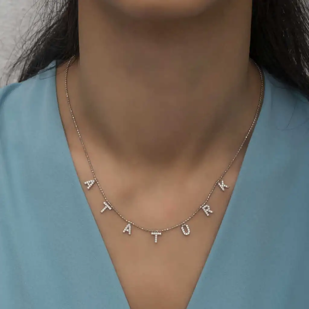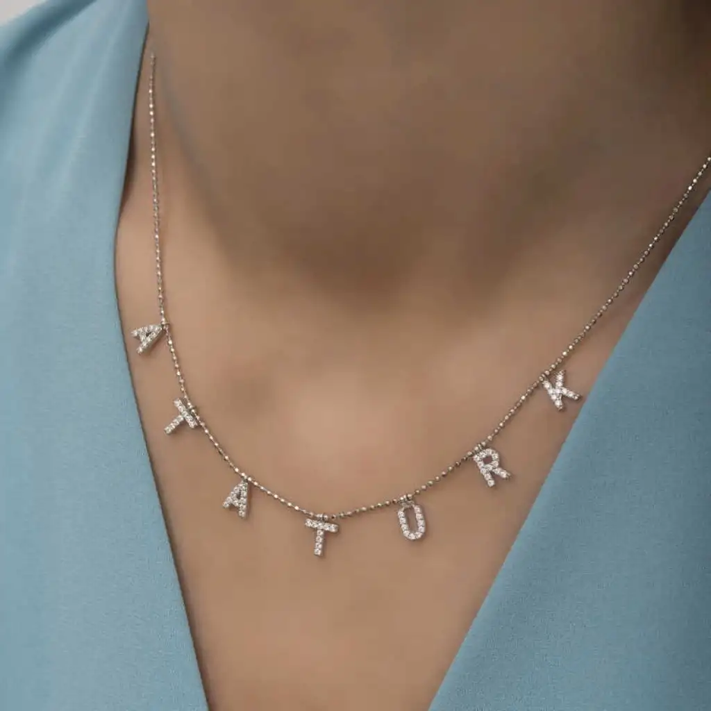 Türkiye Cumhuriyeti'nin kurucusu ve ilk cumhurbaşkanı Mustafa Kemal Atatürk'ün ismi her an yanınızda taşımak ve sevdiklerinizle paylaşmak için kaçırılmayacak bir kolye ile karşı karşıyasınız. Anlam itibariyle sevdiklerinize hediye edebileceğiniz şık hediyelerden biri olacaktır. Bu anlamlı kolye 925 ayar gümüşten imal edilmiştir. Gümüş Atatürk yazılı bayan kolye rodyum kaplama yapılmıştır. Rodyum kaplama yapılan gümüş bayan kolye modelleri parlaklığını uzun süre muhafaza eder. Tüm gümüş bayan kolye modellerinde olduğu gibi gümüş Atatürk yazılı bayan kolye modeli de el emeği ile üretilmiştir. Gümüş ve değerli taşlar nedeniyle belirtilen ürün ağırlığında ± %10 sapma olabilmektedir.
