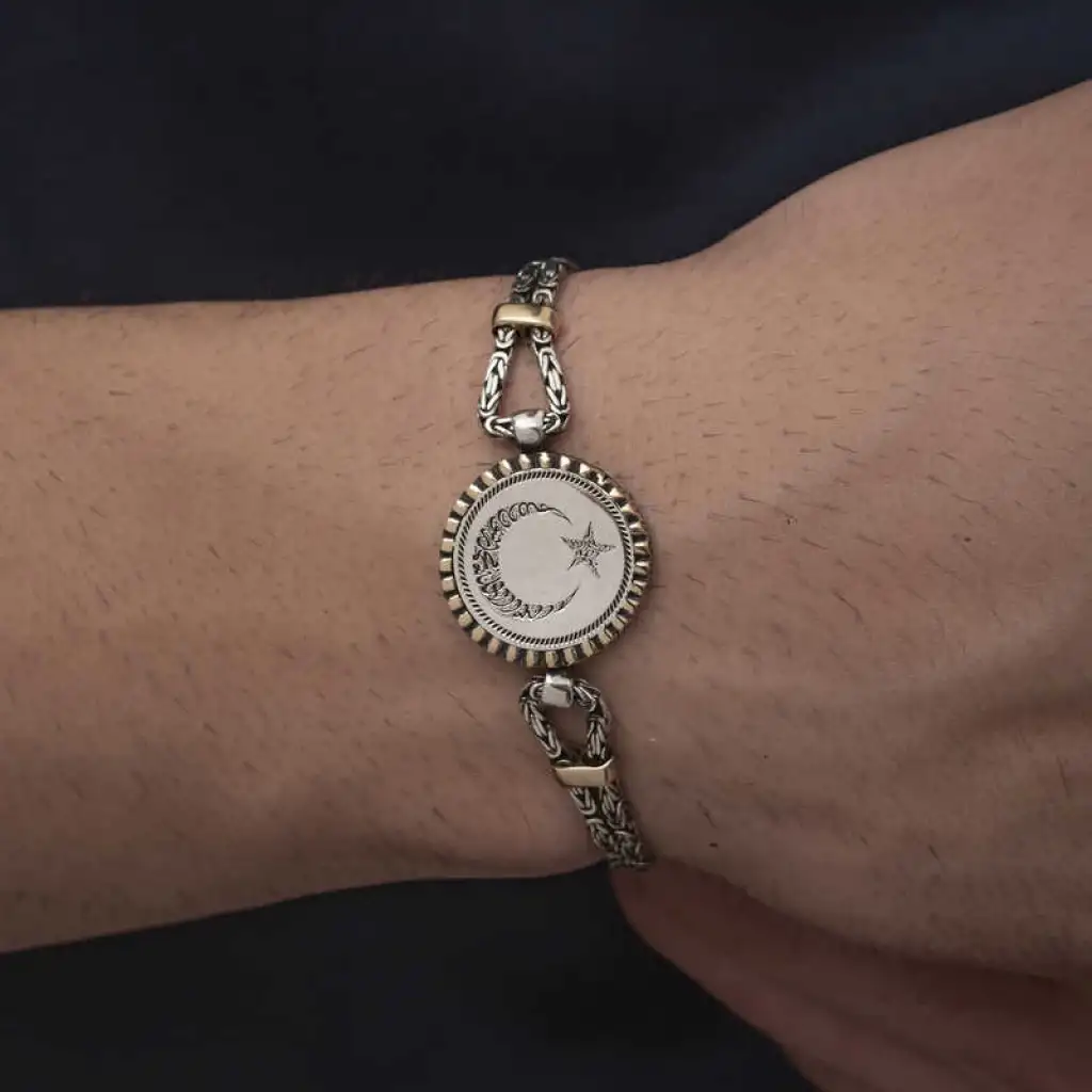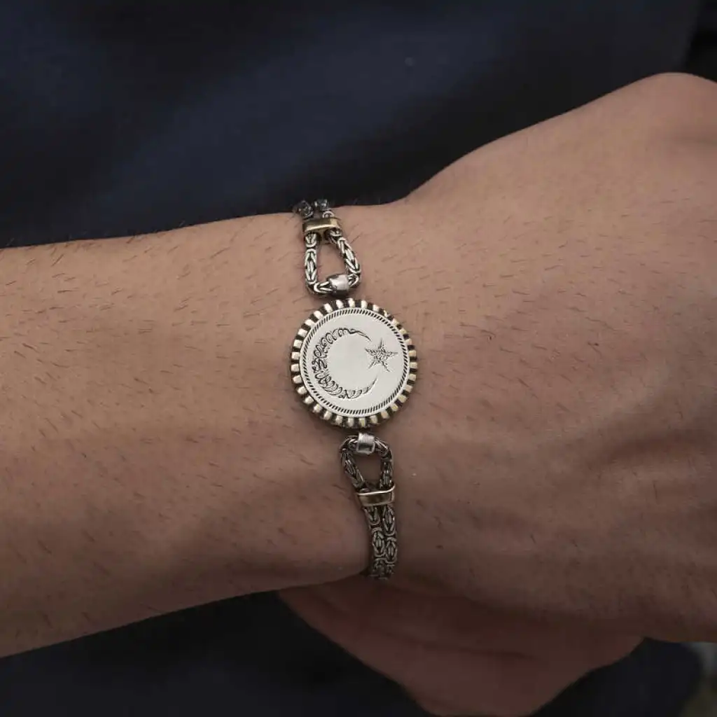 Türk bayrağının ilhamını da kan gölüne yansıyan ay ve yıldızdan aldığını biliyoruz. Bayrağın taşıdığı kutsal anlamı bileklerinde taşımak ve sevdiklerinizle paylaşmak için kaçırılmayacak bir fırsat sunuyoruz. Bu şık Ay yıldız bileklik modeli 925 ayar gümüşten imal edilmiştir. Gümüş üzerine oksit kaplama yapılmıştır. Gümüş oksit, kaplanan ürünler hafif siyah renklendirmeye ve antik bir görünüm elde etmeye yaramaktadır. Ay yıldız erkek bileklik 925 ayar gümüşten imal edilmiştir. Gümüş ve değerli taşlar nedeniyle belirtilen ortalama ürün ağırlığında ± %10 sapma olabilmektedir.