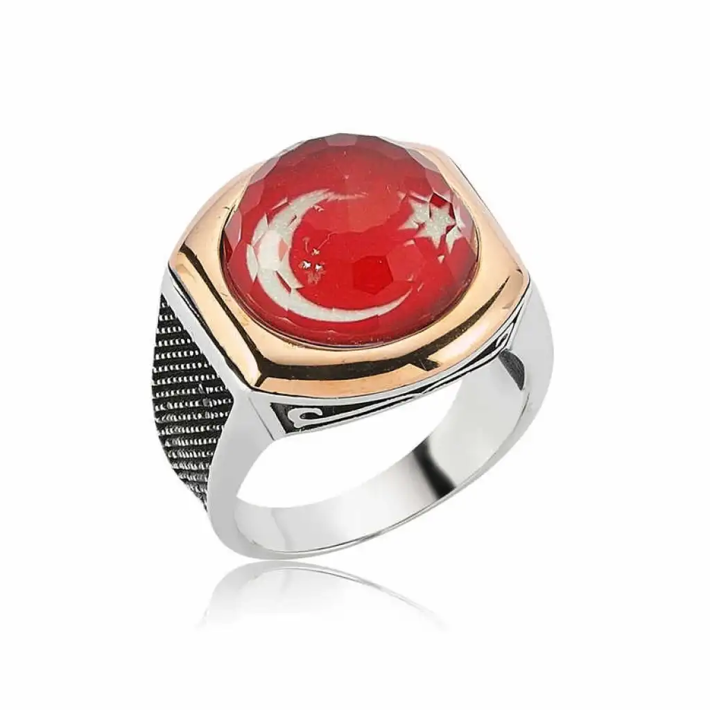 Türk bayrağının ilhamını da kan gölüne yansıyan ay ve yıldızdan aldığını biliyoruz. Bayrağın taşıdığı kutsal anlamı boynunuzda taşımak ve sevdiklerinizle paylaşmak için kaçırılmayacak bir fırsat sunuyoruz. Bu şık tasarım yüzüğü; kendinize yada sevdiklerinize doğum gününde, babalar gününde yada özel günlerde hediye edebilirsiniz. Ay yıldız erkek yüzük 925 ayar gümüşten imal edilmiştir. Gümüş üzerine oksit kaplama yapılmıştır. Tüm gümüş erkek yüzüklerinde olduğu gibi gümüş ay yıldız erkek yüzük de tamamı el emeği ile üretilmiştir. Gümüş ve değerli taşlar nedeniyle belirtilen ortalama ürün ağırlığında ± %10 sapma olabilmektedir.
