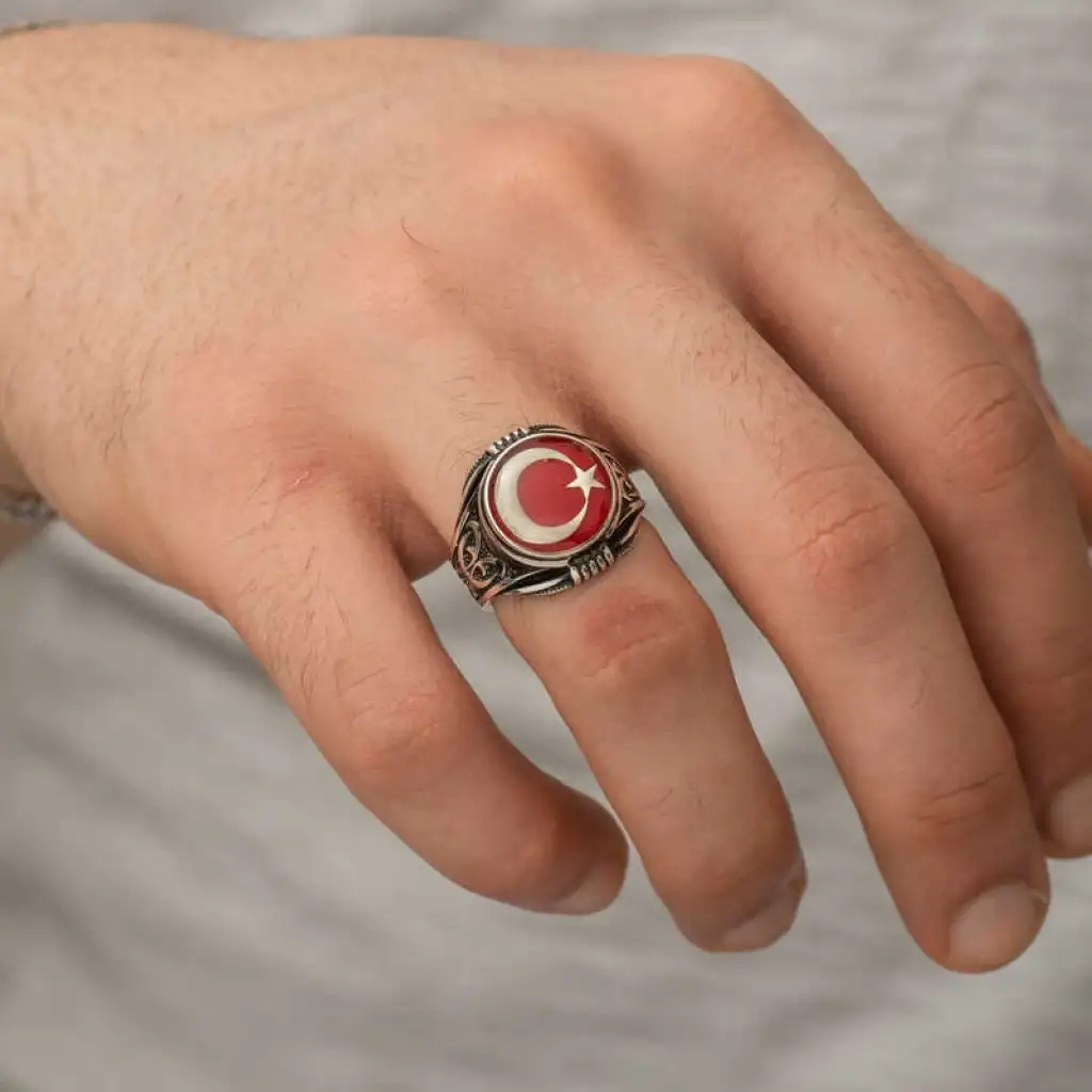 Hilal ve yıldız ya da ay-yıldız; hilal ve hilalin açık ucunda yer alan bir yıldız şeklinden oluşan antik sembol. Bu sembolün kullanıldığı bayraklara çoğunlukla Akdeniz civarında, Orta Doğu ve Orta Asya'da rastlanır. Günümüzde çoğunlukla İslam ülkelerinin bayraklarında kullanılan bir sembol olarak bilinmektedir. Ay- Yıldız simgesi, Türk Bayrağı dahil bir çok bayrakta yer almaktadır. Ay ya da Hilâl, İslâm dini ile özdeşleşmesine rağmen, İslâm öncesi dönemlerde de kullanılmıştır. Ay- Yıldız ve Güneş motifleri, Asyalı Türk- Moğol halklarının evren tasarımı hakkında bilgiler sunar. Fakat Ay ile Yıldız’ın birlikte tasvir edildiği ilk belgeler Mezopotamya’da bugünkü Güney Irak’taki Sümer şehirlerinde ortaya çıkmıştır. Tarihte bariz şekilde hilâlden oluşan Ay-Yıldız motifini ilk kez Sümerler kullanmıştır. Sümerler, İÖ. 3000’de Güney Irak’ta tarihin ilk devletini kurmuşlar ve bugünkü medeniyetin inşasında çok büyük adım atmışlardı. Sümer dili Türkçe’ye oldukça yakın bir dildi. İnançları da Türkler’e büyük ölçüde benzer bir yapıdaydı. Sümer Ay Tanrısı “Nana- Suen” ve Güneş Tanrısı “Utu” veya Tanrıça İnana’nın sembolleri bir arada gösterilerek ilk Hilâl-Yıldız ikilemesi yapılmış oldu. Bu motif bazen taş kabartmalarda, bazen mühürlerde bazen de kil tabletlerde işlenmiş ve günümüze kadar ulaşmıştır. Bu şık yüzüğü; doğum günü hediyesi, sevgililer günü hediyesi olarak özel günlerde tercih edebilirsiniz. Gümüş ay yıldız erkek yüzük 925 ayar gümüşten imal edilmiştir. Gümüş üzerine oksit kaplama yapılmıştır. Oksit kaplama yapılan gümüş yüzükler eskitilmiş görünme sahip olurlar. Gümüş ve değerli taşlar nedeniyle belirtilen ortalama ürün ağırlığında ± %10 sapma olabilmektedir.
