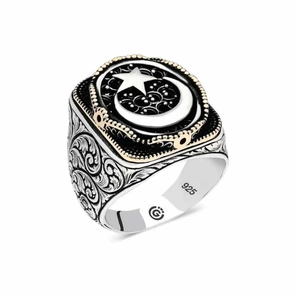 Gümüş Ay yıldız Oval Erkek Yüzük