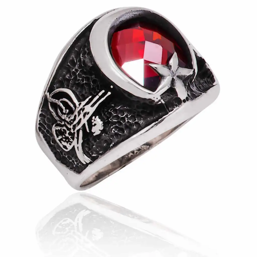 Tuğra Osmanlı devleti padişahlarının şahsi imzalarıdır. Her padişahın imzası birbirinden farklıdır. Günümüzde takılarda sıklıkla kullanılan bir motiftir. Sadece tuğra değil ay yıldız motifi de bayrağımızı simgelediği için sıklıkla kullanılır. Hilal ve yıldız ya da ay-yıldız; hilal ve hilalin açık ucunda yer alan bir yıldız şeklinden oluşan antik semboldür. Bu sembolün kullanıldığı bayraklara çoğunlukla Akdeniz bölgesi civarında, Orta Doğu ve Orta Asya'da rastlanır. Günümüzde çoğunlukla İslam ülkelerinin bayraklarında kullanılan bir sembol olarak bilinmektedir. Ay- Yıldız simgesi, Türk Bayrağı dahil bir çok bayrakta yer almaktadır. Ay ya da Hilâl, İslâm dini ile özdeşleşmesine rağmen, İslâm öncesi dönemlerde de kullanılmış; Ay- Yıldız ve Güneş motifleri Amerika, Avrupa, Anadolu, Ortadoğu ve Orta Asya panteonunda tarih boyunca yer almıştır. Orta Asya’da İÖ. 5 000’lere ait kaya resimlerinden başlayıp daha sonraki şaman davullarında da benzer şekilde tasvir edilen Ay- Yıldız ve Güneş motifleri, Asyalı Türk- Moğol halklarının evren tasarımı hakkında bilgiler sunar. Fakat Ay ile Yıldız’ın birlikte tasvir edildiği ilk belgeler Mezopotamya’da bugünkü Güney Irak’taki Sümer şehirlerinde ortaya çıkmıştır. Gümüş ay yıldız tuğra erkek yüzük modeli severek kullanabileceğiniz ve sevdiklerinize armağan edebileceğiniz bir çok şık bir aksesuardır. Ay yıldız tuğra erkek yüzük modeli 925 ayar gümüş kullanılarak imal edilmiştir. Yüzük üzerine oksit kaplama yapılmıştır. Oksit kaplama yapılan gümüş ay yıldız tuğra erkek yüzük modelleri eskitme bir görünüme kavuşur. Gümüş ay yıldız tuğra erkek yüzükte olduğu gibi tüm gümüş erkek yüzük modelleri tamamen el emeği ile üretilmiştir. Gümüş ve değerli taşlar nedeniyle belirtilen ortalama ürün ağırlığında ± %10 sapma olabilmektedir.