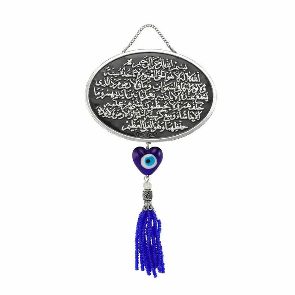 Ayetel kürsi kuran’ı kerimde 2. Süre olan Bakara süresinin 255. ayetidir. Yani ayetel kürsi kuranı kerimde geçen bir ayettir. İsmini ayet içinde geçen “kürsiyuhus semeveti” kelimesindeki kürsiden almıştır. Bu dua namazda fatiha süresinden sonra okunabileceği gibi Allahı tesbih etme yada dua etme amacıyla da okunabilir.Püsküllü nazar boncuklu Ayet-El Kürsi yazılı, gümüş ayet ile duvarlarınızı süsleyin. Sevdiklerinizin iş yerlerine ya da evlerine götürebileceğiniz manevi anlamı olan hoş bir hediyedir.Ayete-l Kürsi FaziletiAllah ki, O’ndan başka ilah yoktur. O hayydır, kayyûmdur.Kendisine ne uyku gelir ne de uyuklama.Göklerde ve yerdekilerin hepsi O’nundur. O’nun izni olmadan katında kim şefaat edebilir? O, kullarının yaptıklarını ve yapacaklarını bilir. (Hiçbir şey O’na gizli kalmaz.) O’nun bildirdiklerinin dışında insanlar,O’nun ilminden hiçbir şeyi tam olarak bilemezler. O’nun kürsüsü gökleri ve yeri içine alır, onları koruyup gözetmek kendisine zor gelmez. O, yücedir, büyüktür. Ürünlerimizin tamamı el emeği ile üretilmiştir. Gümüş ve değerli taşlar nedeniyle belirtilen ortalama ürün ağırlığında ± %10 sapma olabilmektedir.