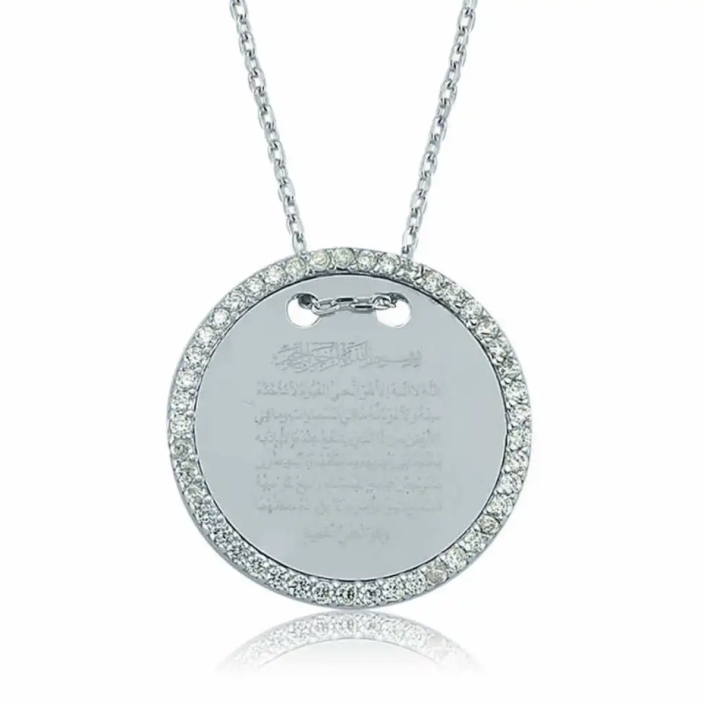 Ayetel kürsi kuran’ı kerimde 2. Süre olan Bakara süresinin 255. ayetidir. Yani ayetel kürsi Kuran-ı Kerimde geçen bir ayettir. İsmini ayet içinde geçen “kürsiyuhus semeveti” kelimesindeki kürsiden almıştır. Bu dua namazda fatiha süresinden sonra okunabileceği gibi Allah'ı tesbih etme yada dua etme amacıyla da okunabilir. Ayete-l Kürsi Fazileti; Allah ki, O’ndan başka ilah yoktur. O Hayydır, Kayyûm'dur. Kendisine ne uyku gelir ne de uyuklama. Göklerde ve yerdekilerin hepsi O’nundur. O’nun izni olmadan katında kim şefaat edebilir? O, kullarının yaptıklarını ve yapacaklarını bilir. (Hiçbir şey O’na gizli kalmaz.) O’nun bildirdiklerinin dışında insanlar, O’nun ilminden hiçbir şeyi tam olarak bilemezler. O’nun kürsüsü gökleri ve yeri içine alır, onları koruyup gözetmek kendisine zor gelmez. O, yücedir, büyüktür. Ayetel Kürsi Bayan Kolye modeli 925 ayar gümüşten imal edilmiştir. Gümüş üzerine rodyum kaplama yapılmıştır. Rodyum kaplama yapılan gümüş bayan kolye modelleri parlaklığını uzun süre muhafaza eder ve oksitlenmesi gecikir. Gümüş olan zincir boyu ortalama 45 cm'dir. Gümüş Ayetel Kürsi plaka bayan kolye modeli gibi tüm gümüş bayan kolye modelleri de el emeği ile üretilmiştir. Gümüş ve değerli taşlar nedeniyle belirtilen ortalama ürün ağırlığında ± %10 sapma olabilmektedir.
