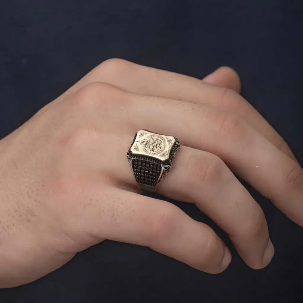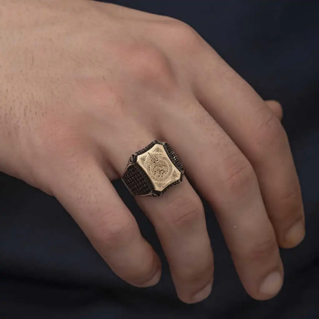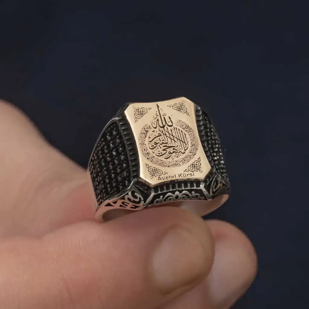 Ayetel kürsi kuran’ı kerimde 2. Süre olan Bakara süresinin 255. ayetidir. Yani ayetel kürsi Kuran-ı Kerimde geçen bir ayettir. İsmini ayet içinde geçen “kürsiyuhus semeveti” kelimesindeki kürsiden almıştır. Bu dua namazda fatiha süresinden sonra okunabileceği gibi Allah'ı tesbih etme yada dua etme amacıyla da okunabilir. Ayete-l Kürsi Fazileti; Allah ki, O’ndan başka ilah yoktur. O Hayydır, Kayyûm'dur. Kendisine ne uyku gelir ne de uyuklama. Göklerde ve yerdekilerin hepsi O’nundur. O’nun izni olmadan katında kim şefaat edebilir? O, kullarının yaptıklarını ve yapacaklarını bilir. (Hiçbir şey O’na gizli kalmaz.) O’nun bildirdiklerinin dışında insanlar, O’nun ilminden hiçbir şeyi tam olarak bilemezler. O’nun kürsüsü gökleri ve yeri içine alır, onları koruyup gözetmek kendisine zor gelmez. O, yücedir, büyüktür. Firuze taş üzerine yazılmış Ayetel Kürsi Yazılı Erkek Yüzük 925 ayar gümüşten imal edilmiştir. Gümüş üzerine rodyum kaplama yapılmıştır. Rodyum kaplama yapılan gümüş erkek yüzük modelleri parlaklığını uzun süre muhafaza eder ve oksitlenmesi gecikir. Gümüş Ayetel Kürsi Yazılı Erkek Yüzük modeli gibi tüm gümüş erkek yüzük modelide el emeği ile üretilmiştir. Gümüş ve değerli taşlar nedeniyle belirtilen ortalama ürün ağırlığında ± %10 sapma olabilmektedir.