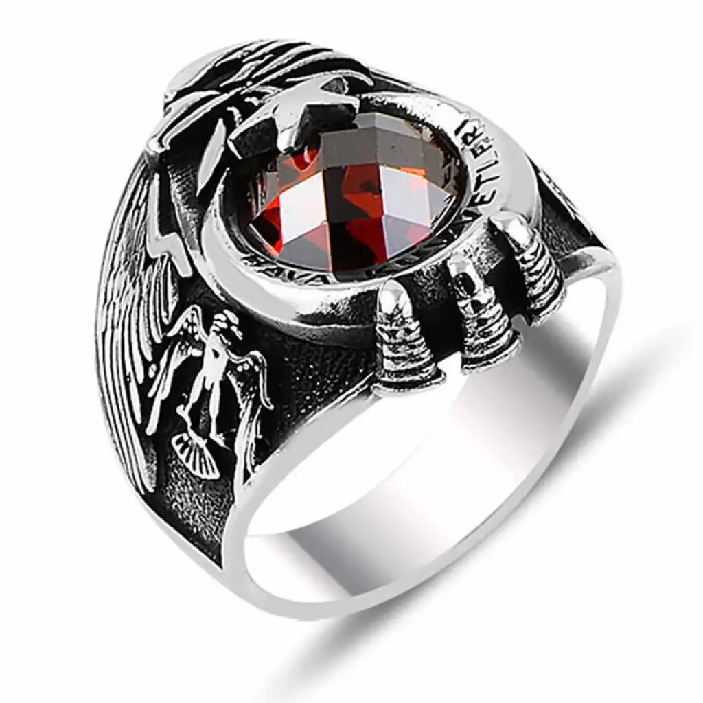 Gümüş Ayyıldız Hava Kuvvetleri Kırmızı Taşlı Erkek Yüzük