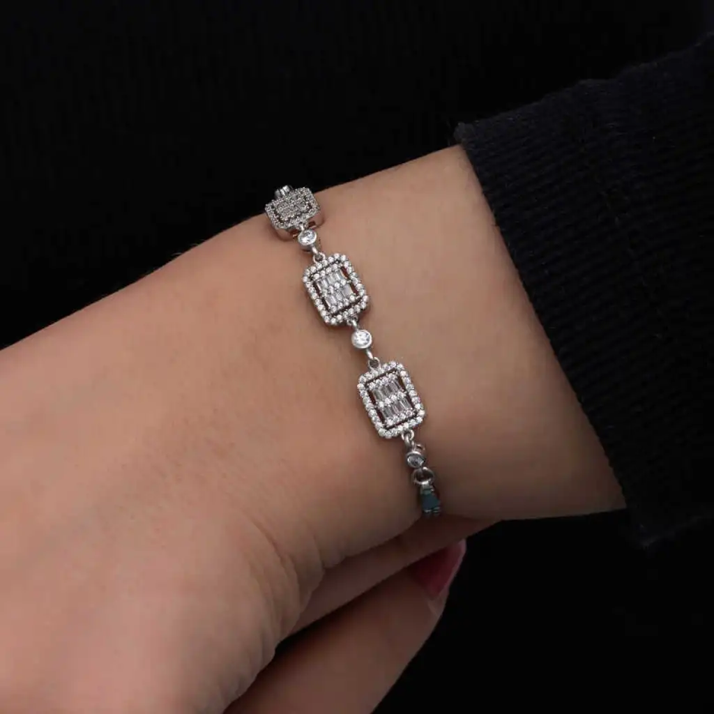 Modaya uyumlu şekilde tasarlanan gümüş baget bileklik modellerini hem gündelik yaşantınızda hem özel gün ve gecelerinizde şık bir şekilde kullanabilirsiniz. Yenilikçi her yaştan kadının beğenisine hitap eden ürünlerle kombinlerinizi tamamlayabilirsiniz. Her biri farklı bir stile hitap edebilen tasarımlarla sizler de spor, klasik ve alternatif giyim tarzlarınıza uygun modellerimizi tercih edebilirsiniz. Bu şık bileklik; doğum günü hediyesi, sevgililer günü hediyesi veya özel günlerde tercih edilebilecek mükemmel bir seçenektir. Gümüş baget taşlı kadın bileklik 925 ayar gümüşten imal edilmiştir. Bu bileklik üzerinde rodyum kaplama vardır. Rodyum kaplama yapılan ürünler parlaklığını uzun süre muhafaza eder, oksitlenmesini geciktirir. Tüm gümüş kadın bileklik modellerinde olduğu gibi gümüş baget taşlı kadın bileklik modeli de el emeği ile üretilmiştir. Gümüş ve değerli taşlar nedeniyle belirtilen ortalama ürün ağırlığında ± %10 sapma olabilmektedir.