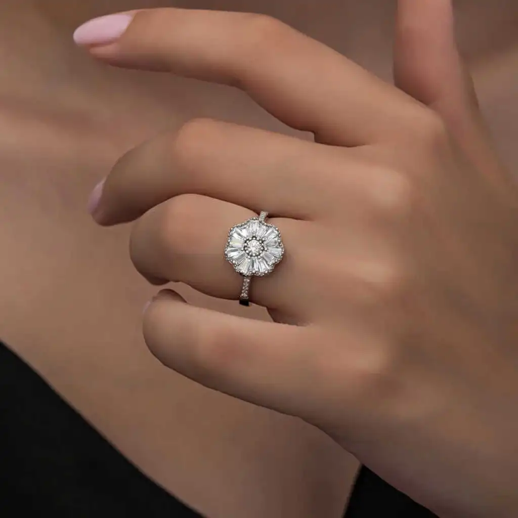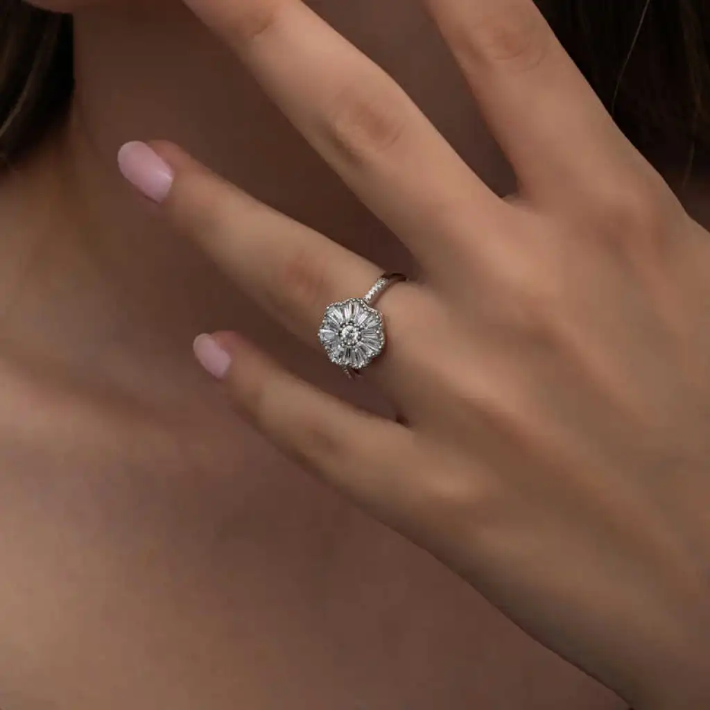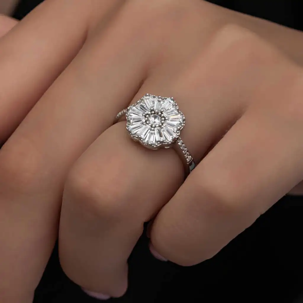 Işıl ışıl baget taşlarla süslenmiş bu şık yüzük modeli; doğum günü hediyesi, sevgililer günü hediyesi veya annelere hediye olarak özel günlerde tercih edebileceğiniz çok şık bir seçenektir. Baget taşlı kadın yüzük 925 ayar gümüşten imal edilmiştir. Gümüş üzerine rodyum kaplama yapılmıştır. Rodyum kaplama yapılan gümüş yüzükler parlaklığını uzun süre muhafaza eder, oksitlenmesi gecikir. Üzerinde bulunan taşlar baget ve zirkondur. Tüm kadın gümüş yüzüklerde olduğu gibi gümüş baget taşlı kadın yüzük modeli de el emeği ile üretilmiştir. Gümüş ve değerli taşlar nedeniyle belirtilen ortalama ürün ağırlığında ± %10 sapma olabilmektedir.