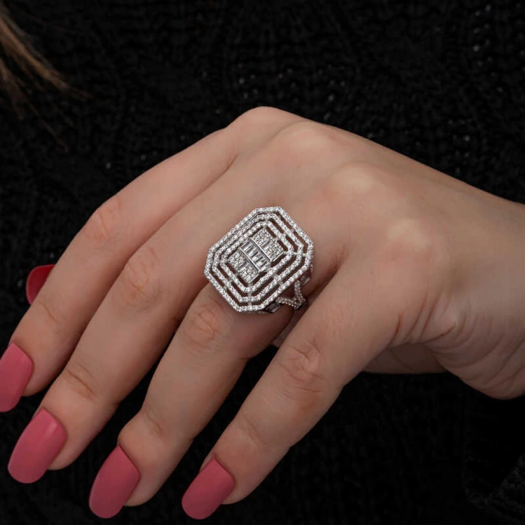 Işıl ışıl baget ve zirkon taşlarla süslenmiş bu şık yüzük modeli; doğum günü hediyesi, sevgililer günü hediyesi veya annelere hediye olarak özel günlerde tercih edebileceğiniz çok şık bir seçenektir. Yüzük 925 ayar gümüşten imal edilmiştir. Gümüş üzerine rodyum kaplama yapılmıştır. Rodyum kaplama yapılan gümüş yüzükler parlaklığını uzun süre muhafaza eder, oksitlenmesi gecikir. Tüm kadın gümüş yüzüklerde olduğu gibi gümüş baget taşlı kadın yüzük modeli de el emeği ile üretilmiştir. Gümüş ve değerli taşlar nedeniyle belirtilen ortalama ürün ağırlığında ± %10 sapma olabilmektedir.