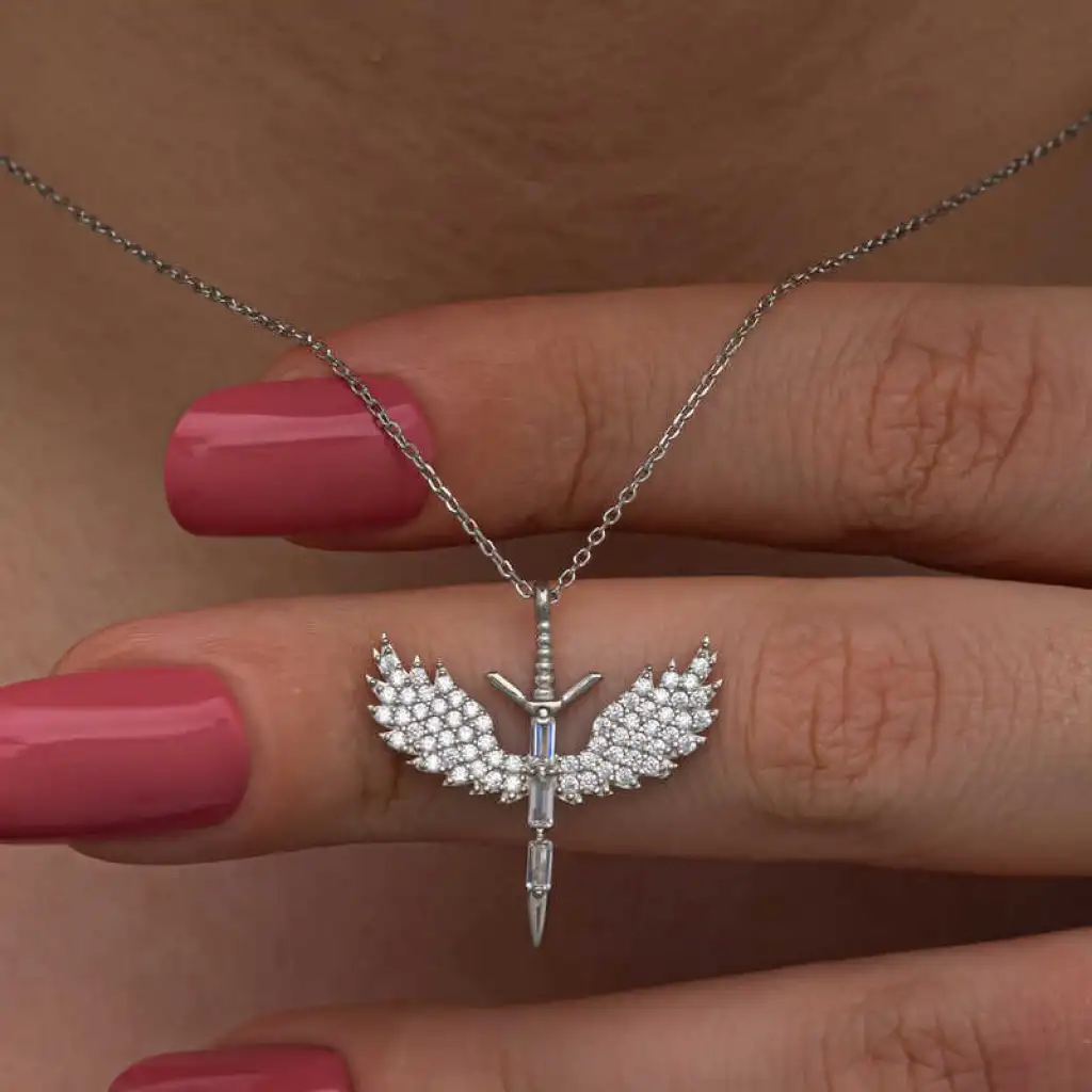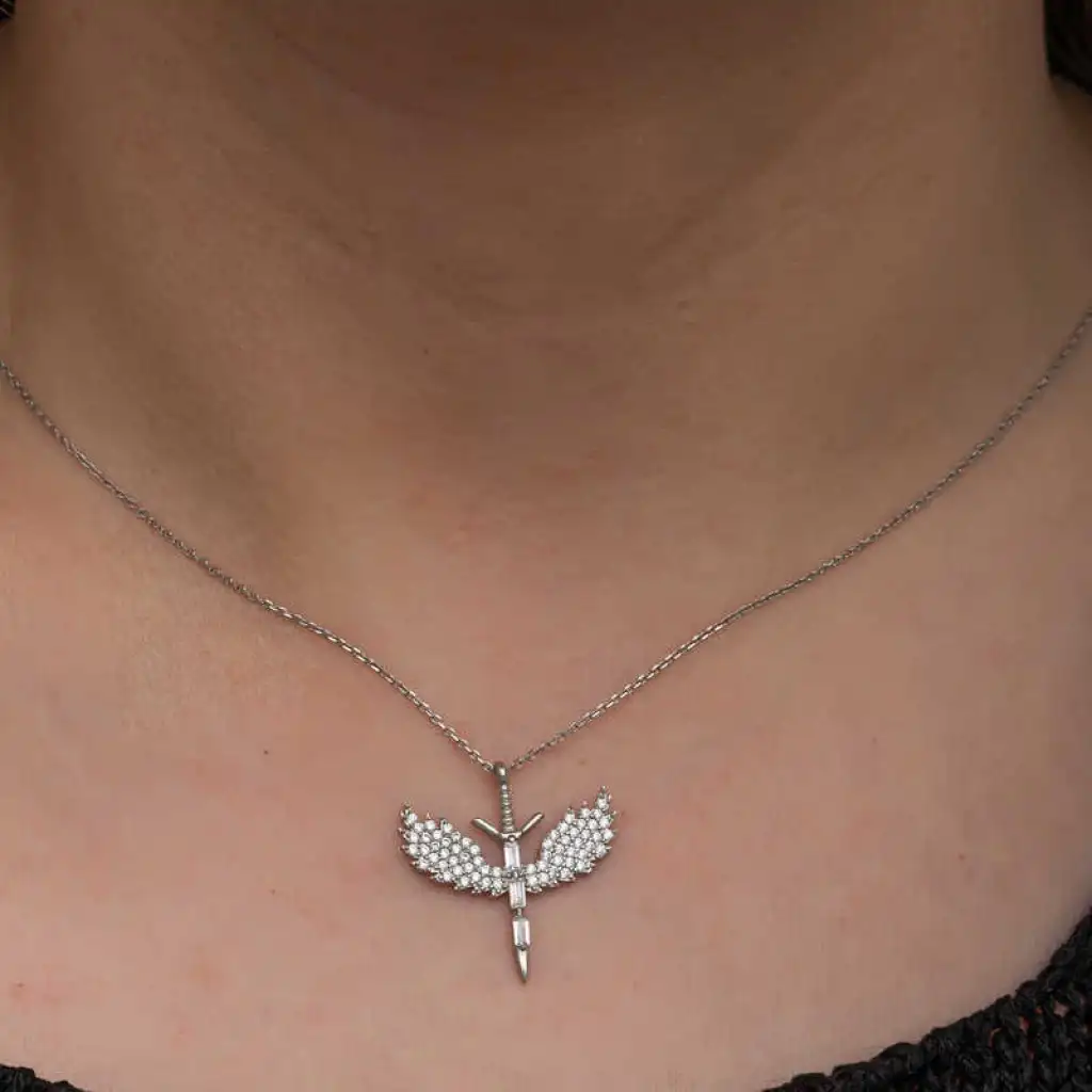 Kılıç tarih boyunca bir çok uygarlık tarafından, ateşli silahların icadından önce insan oğlunun iktidar gücünü ortaya koyup uygulayabilmesi için kullandığı çeşitli boyutlarda olabilen, keskin kenarlı, sivri uçlu bir silahtır. Kılıcın boyutu tarihler boyunca,farklı uluslarda,farklı boyutlarda olmuştur. Türkler Orta Asya’ya göç edince kılıç yapım merkezleri kurmuştur. Kılıç geleneği Selçuklular ve Osmanlı dönemlerinde devam eder. Anadolu kılıçlarını batının kılıçlarından ayıran özellik; eğri, çok su verilmiş ve eğriliklerinden dolayı çok rahat kullanılabilir olmalarıdır. Mikail kılıcı kolye modeli 925 ayar gümüşten imal edilmiştir. Gümüş üzerine rodyum kaplama yapılmıştır. Rodyum kaplama yapılan gümüş kadın kolye modelleri parlaklığını uzun süre muhafaza eder ve oksitlenmesi gecikir. Kolye üzerinde bulunan taşlar zirkon ve bagettir. Gümüş kolye ortalama boyu 45 cm'dir. Tüm kadın kolye modellerinde olduğu gibi gümüş baget taşlı mikail kılıcı kolye modeli de el emeği ile üretilmiştir. Gümüş ve değerli taşlar nedeniyle belirtilen ortalama ürün ağırlığında ± %10 sapma olabilmektedir.