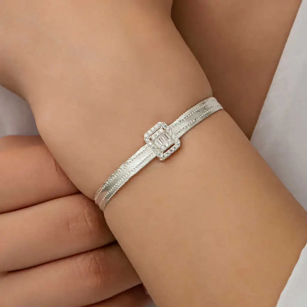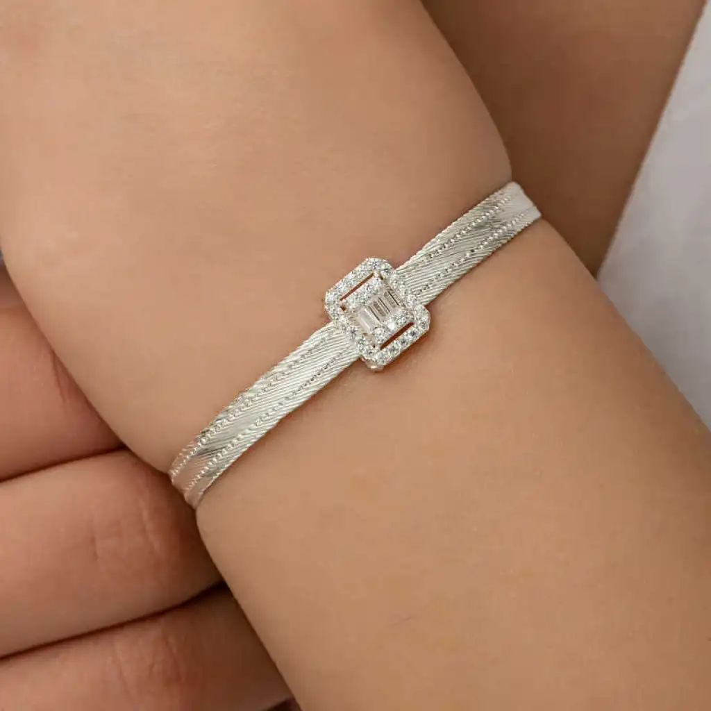 Modaya uyumlu şekilde tasarlanan gümüş baget taşlı trabzon hasır bileklik modellerini hem gündelik yaşantınızda hem özel gün ve gecelerinizde şık bir şekilde kullanabilirsiniz. Yenilikçi her yaştan kadının beğenisine hitap eden ürünlerle kombinlerinizi tamamlayabilirsiniz.Bu şık bileklik; doğum günü hediyesi, sevgililer günü hediyesi veya özel günlerde tercih edilebilecek mükemmel bir seçenektir. Gümüş baget taşlı trabzon hasır kadın bileklik 925 ayar gümüşten imal edilmiştir. Bu bileklik üzerinde rodyum kaplama vardır. Rodyum kaplama yapılan ürünler parlaklığını uzun süre muhafaza eder, oksitlenmesini geciktirir. Tüm gümüş kadın bileklik modellerinde olduğu gibi gümüş baget taşlı trabzon hasır kadın bileklik modeli de el emeği ile üretilmiştir. Gümüş ve değerli taşlar nedeniyle belirtilen ortalama ürün ağırlığında ± %10 sapma olabilmektedir.
