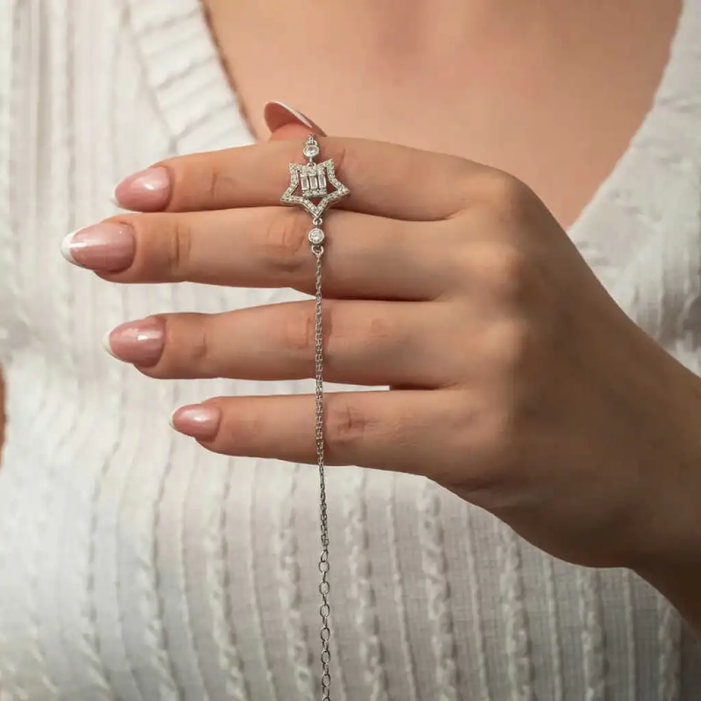 Gecenin parlak ışıltısını anımsatan yıldız, sembolik olarak evrenin sonsuzluğunu, uzaktaki bir noktayı ifade eder. Parıltının, ışığın, aydınlığın ve umudun sembolüdür. Her insan özel, her sevilen eşsizdir. Eşsiz sevginin ömür boyu sürecek birlikteliğin simgesi gümüş yıldız kadın bileklik ile sevdiklerinizi mutlu etmeye ne dersiniz. Gümüş üzerine rodyum kaplama yapılmıştır. Rodyum kaplama yapılan ürünler parlaklığını uzun süre muhafaza eder ve oksitlenmeyi geciktirir. Üzerinde bulunan beyaz taşlar baget ve zirkondur. Gümüş kadın bilekliklerin tamamında olduğu gibi gümüş yıldız kadın bileklik de el emeği ile üretilmiştir. Gümüş ve değerli taşlar nedeniyle belirtilen ortalama ürün ağırlığında ± %10 sapma olabilmektedir.