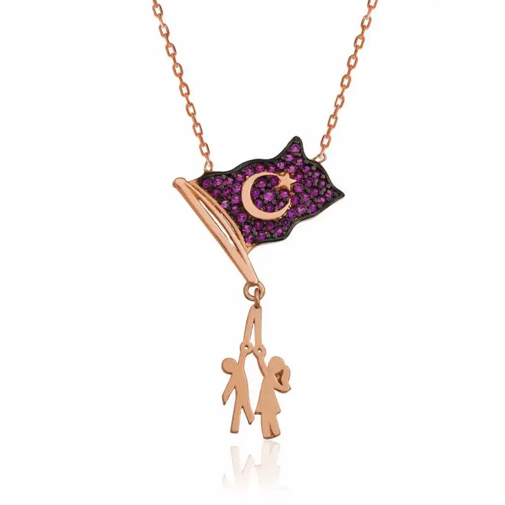 Bayrak; bir milletin varlığının ve bağımsızlığının sembolü, tarihinin hatırasıdır. Bayrağın değeri temsil ettiği milletin kıymeti ile ölçülür. Devletin hakimiyetini, bağımsızlığını ve şerefini temsil ettiği için bayrağa saygı gösterilir. Kırmızı zemin üzerinde hilal ve yıldız bulunan bayrağa efsanevi bir anlam katan inanış vardır. Osmanlıların 1448'de, düşmanlarını ağır bir yenilgiye uğrattığı Kosova savaşından sonraki gece; savaş alanında oluşmuş kan gölünün üzerinde gökyüzünden yansıyan hilal ve yıldız yan yana görünmüştür. Böylece sultan II Murad bu simgeyi devlet bayrakları arasında kullanmaya başlamıştır. Sizde sevdiklerinize gümüş türk bayrağı tutan çocuklar kolyeyi armağan edebilir onları sevindirebilirsiniz. Bayrak tutan çocuklar kolye modeli 925 ayar gümüşten imal edilmiştir. Gümüş üzerine rose kaplama yapılmıştır. Rose kaplama yapılan gümüş kolye modelleri parlaklığını uzun süre muhafaza eder ve oksitlenmesi gecikir. Gümüş kolyenin ortalama boyu 45 cm'dir. Tüm kolye modellerinde olduğu gibi gümüş bayrak tutan çocuklar kolye modeli de el emeği ile üretilmiştir. Gümüş ve değerli taşlar nedeniyle belirtilen ortalama ürün ağırlığında ± %10 sapma olabilmektedir.