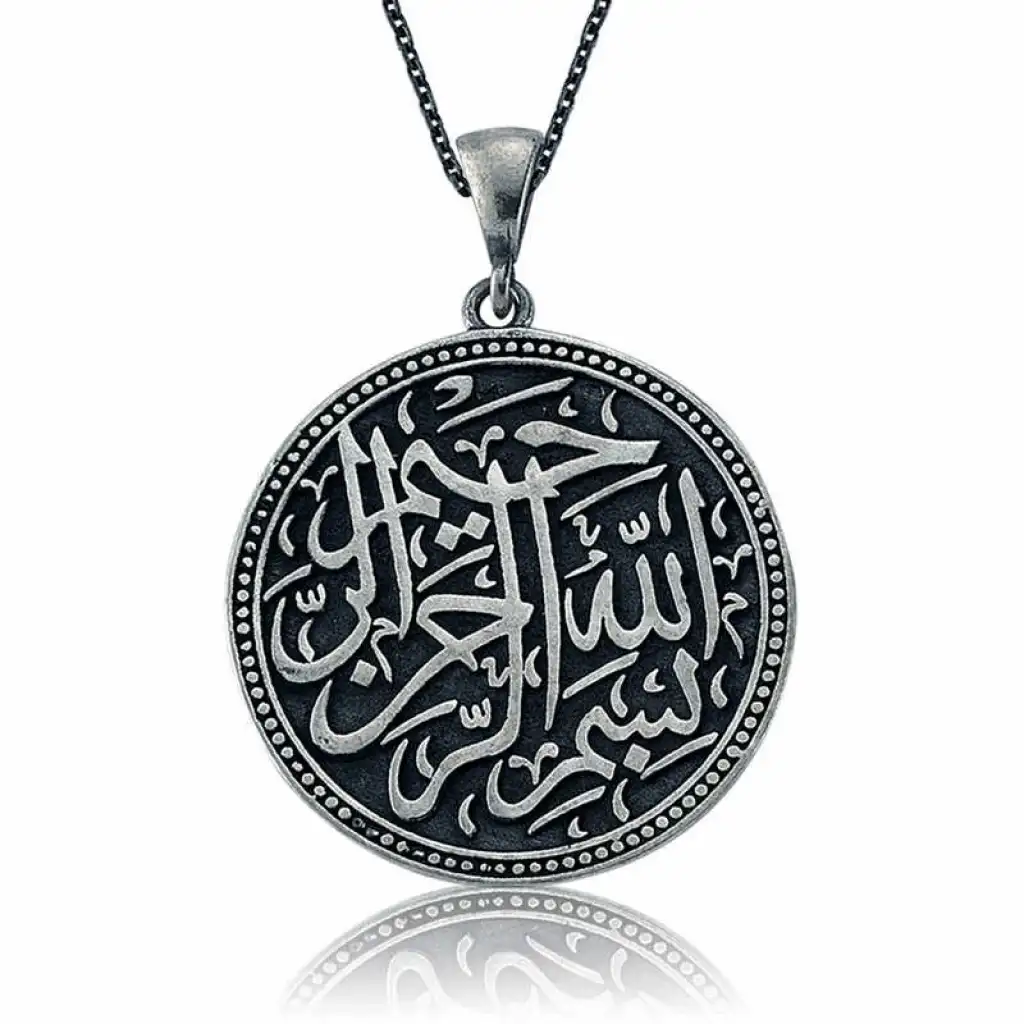 "Besmele" "Bismillâhirrahmânirrahîm"in kısaltılmış şeklidir. Hayırlı bir işe başlarken, Allah'ın ismini anarak işe başlamak mânâsına gelir. Besmele-i Şerif bayan kolye sizler için tasarlandı. Bu şık kolye modeli 925 ayar gümüşten imal edilmiştir. Gümüş üzerine oksit kaplama yapılmıştır. Oksit kaplama yapılan bayan kolyeler parlaklığını uzun süre muhafaza eder. Gümüş olan zincir uzunluğu 45 cm'dir. Tüm gümüş bayan kolyelerde olduğu gibi gümüş besmele-i şerif bayan kolye modeli de el emeği ile üretilmiştir. Gümüş ve değerli taşlar nedeniyle belirtilen ortalama ürün ağırlığında ± %10 sapma olabilmektedir.