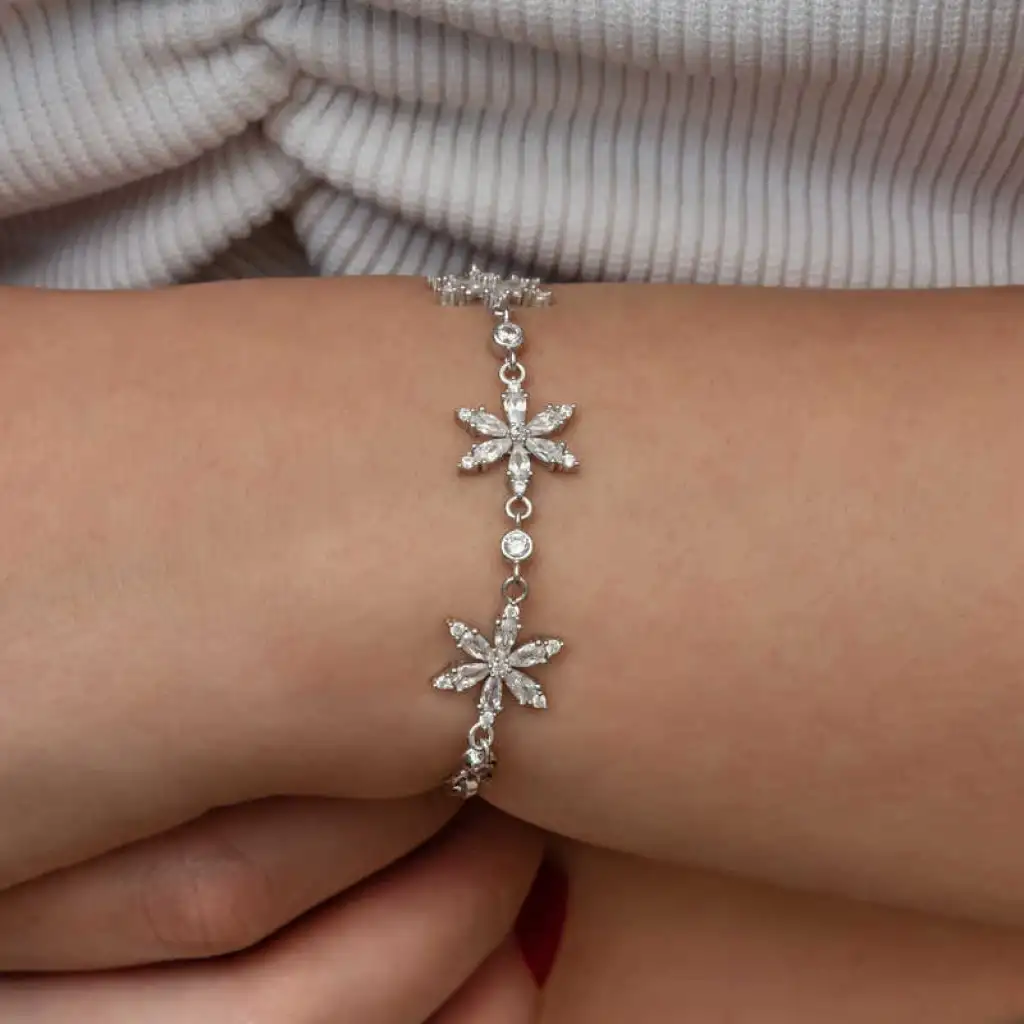 Beyaz Lotus Çiçeği Kadın Bileklik, zarif bir tasarıma sahip olan ve hem estetik hem de anlam derinliği taşıyan bir aksesuardır. Lotus çiçeği, birçok kültürde saflığın, yenilenmenin ve ruhsal büyümenin sembolü olarak kabul edilir. Bu bileklik, şıklığı ve zarafetiyle ön planda olup, günlük kullanımda veya özel etkinliklerde rahatlıkla takılabilir.Gümüş üzerine rodyum kaplama yapılmıştır. Rodyum kaplama yapılan beyaz lotus çiçeği kadın bileklik modelleri parlaklığını uzun süre muhafaza eder.Gümüş ve değerli taşlar nedeniyle belirtilen ortalama ürün ağırlığında ± %10 sapma olabilmektedir.