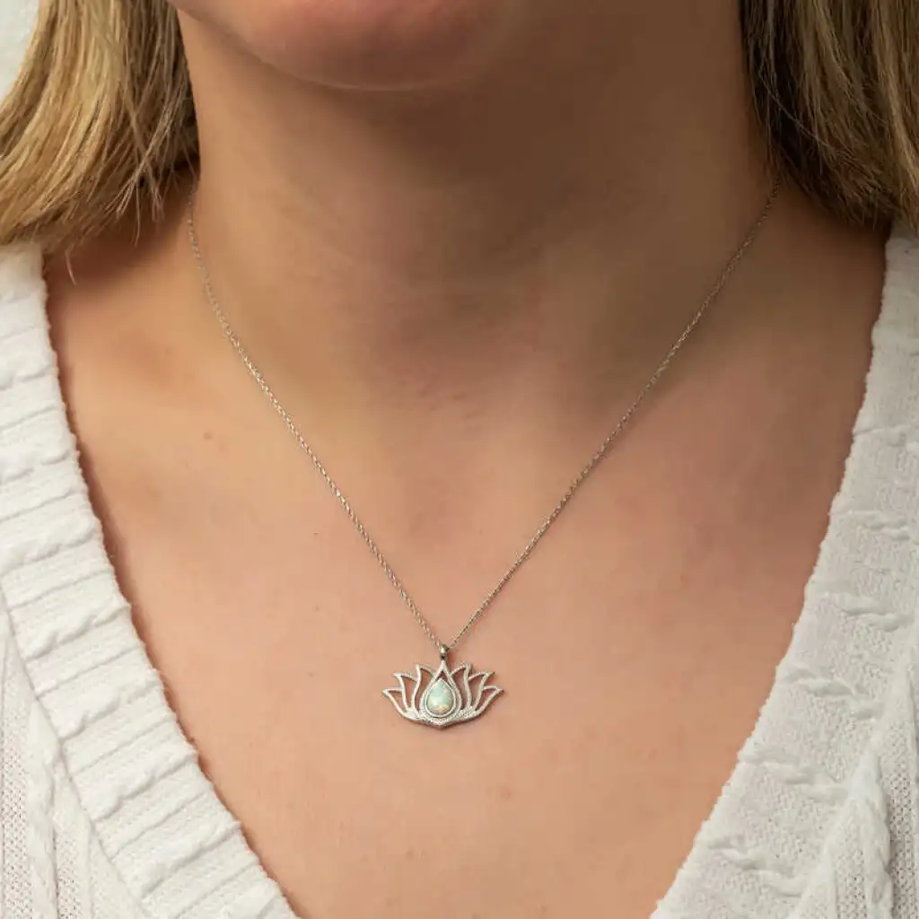 Gümüş Beyaz Opal Taşlı Lotus Kadın Kolye