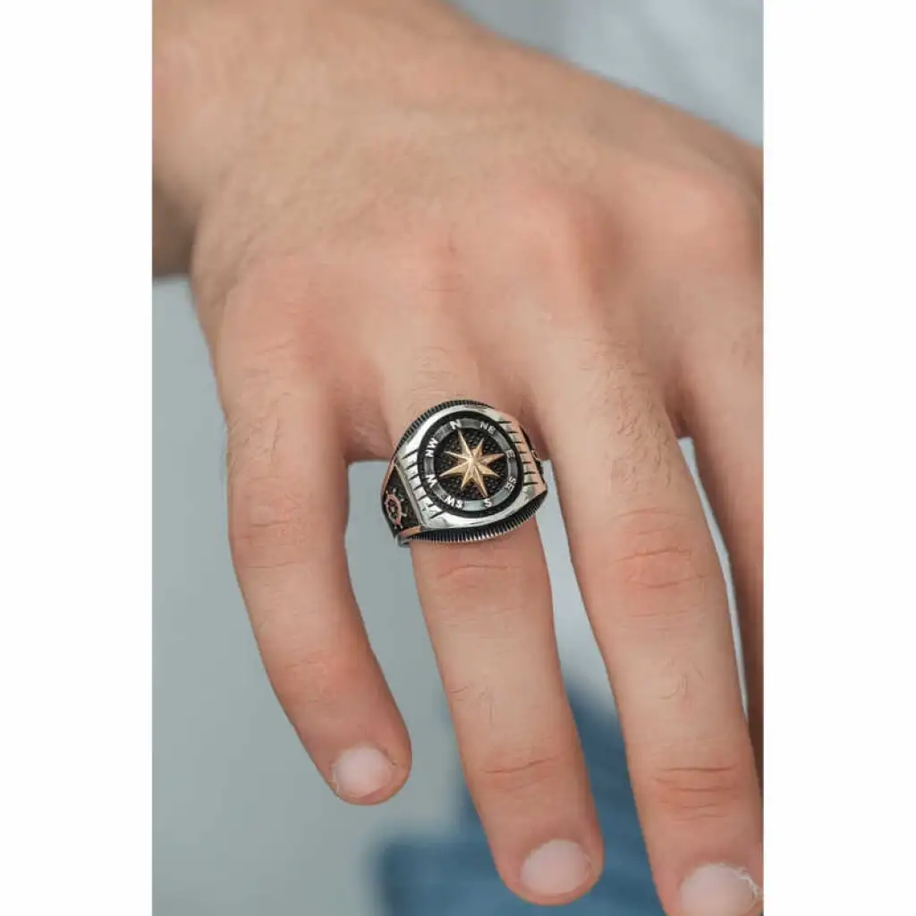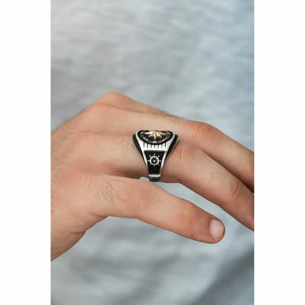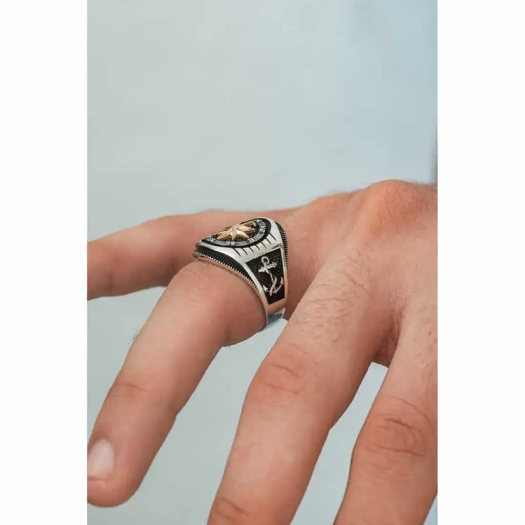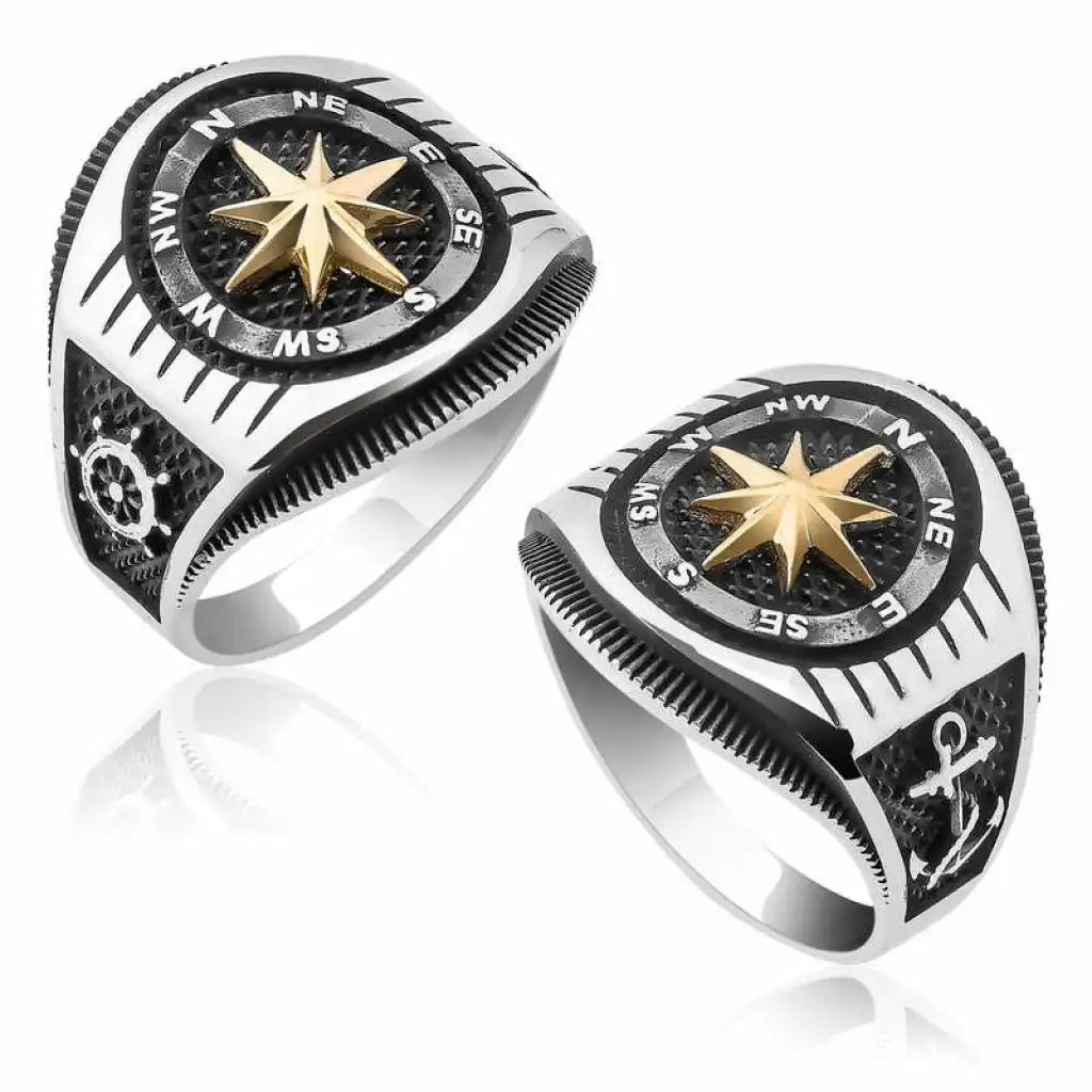 Gümüş Çapa Detaylı Pusula Erkek Yüzük