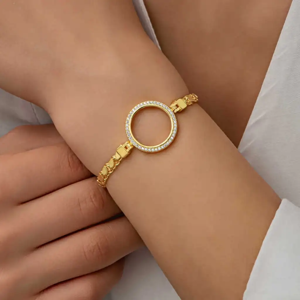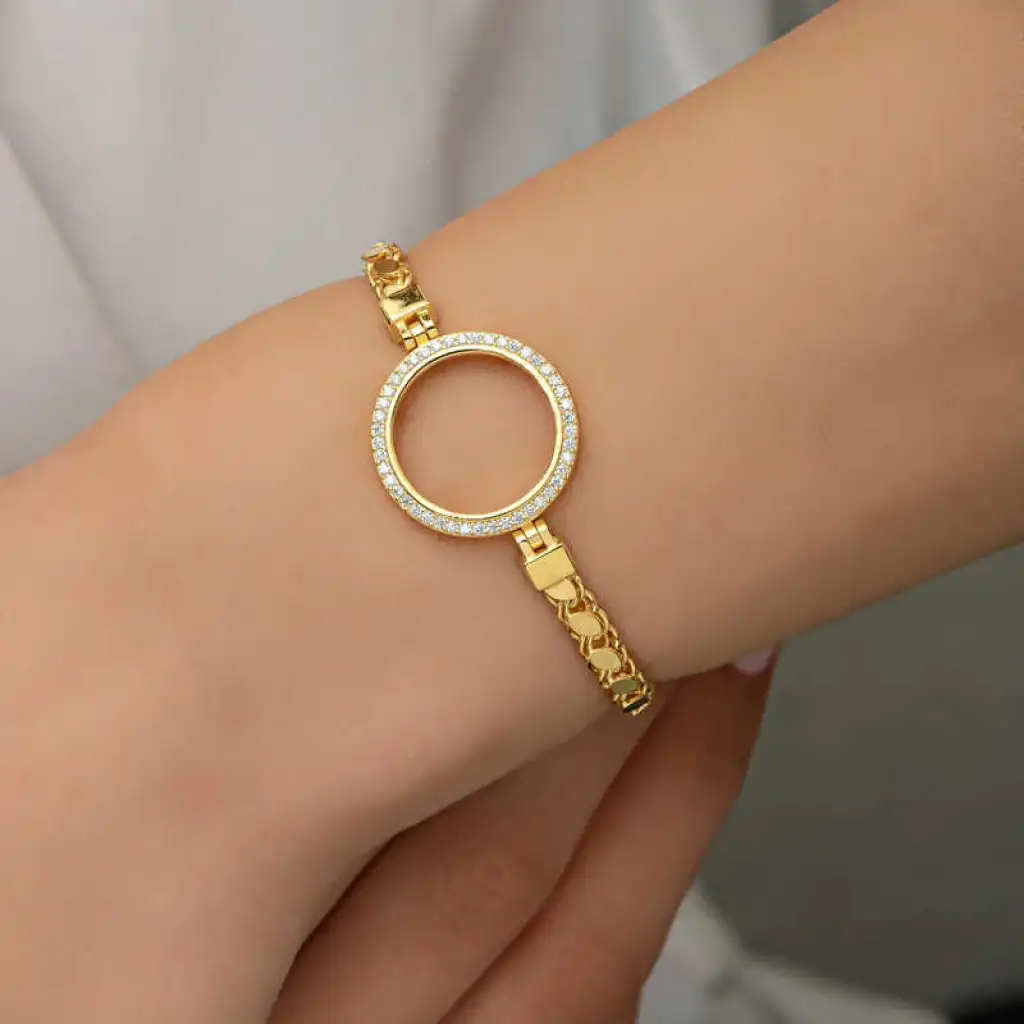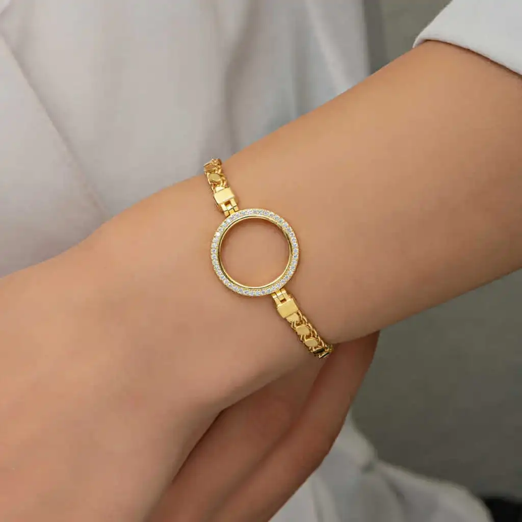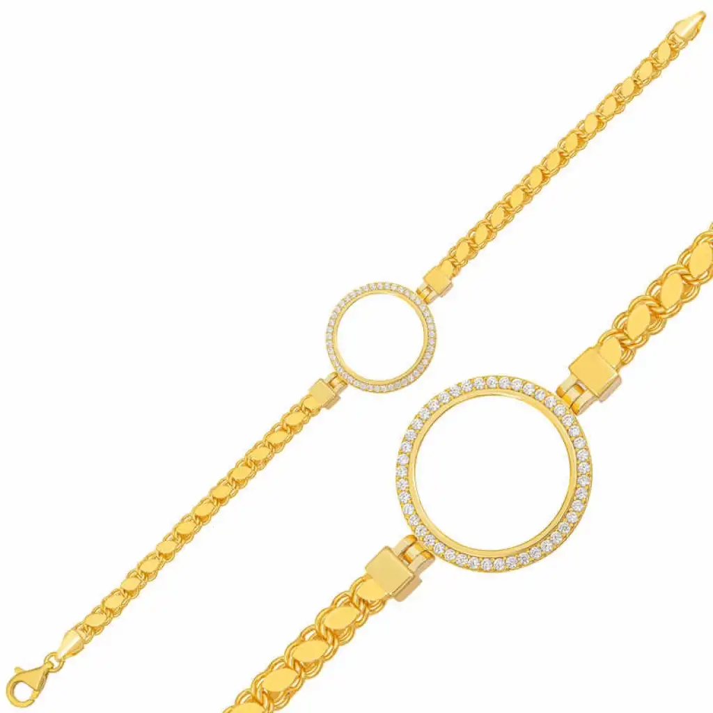 Yuvarlak form deseniyle şıklığı ifade eden gümüş çeyrek takılabilen altın kadın bileklik modeli ile sevginiz, sevdiğiniz kadının teninde hayat bulsun. Genç sevgililerin ve kendini genç hissedenlerin özel günlerde de seçebileceği bu kadın bileklik modeli ile sevdiğinizin bileğini aşkla süsleyin. Sizin olduğu kadar sevdiklerinizin de keyifle takacağı kadın bileklik sevdiğinize en güzel hediyelerden biri olacaktır. Bu kadın bileklik modeli 925 ayar gümüşten imal edilmiştir. Gümüş üzerine altın kaplama yapılmıştır. Altın kaplama yapılan gümüş kadın bileklik modelleri parlaklığını uzun süre muhafaza eder ve oksitlenmesi gecikir. Bileklik üzerinde bulunan beyaz taşlar zirkondur. Tüm kadın bileklik modellerinde olduğu gibi gümüş kadın bileklik modeli de el emeği ile üretilmiştir. Gümüş ve değerli taşlar nedeniyle belirtilen ortalama ürün ağırlığında ± %10 sapma olabilmektedir.