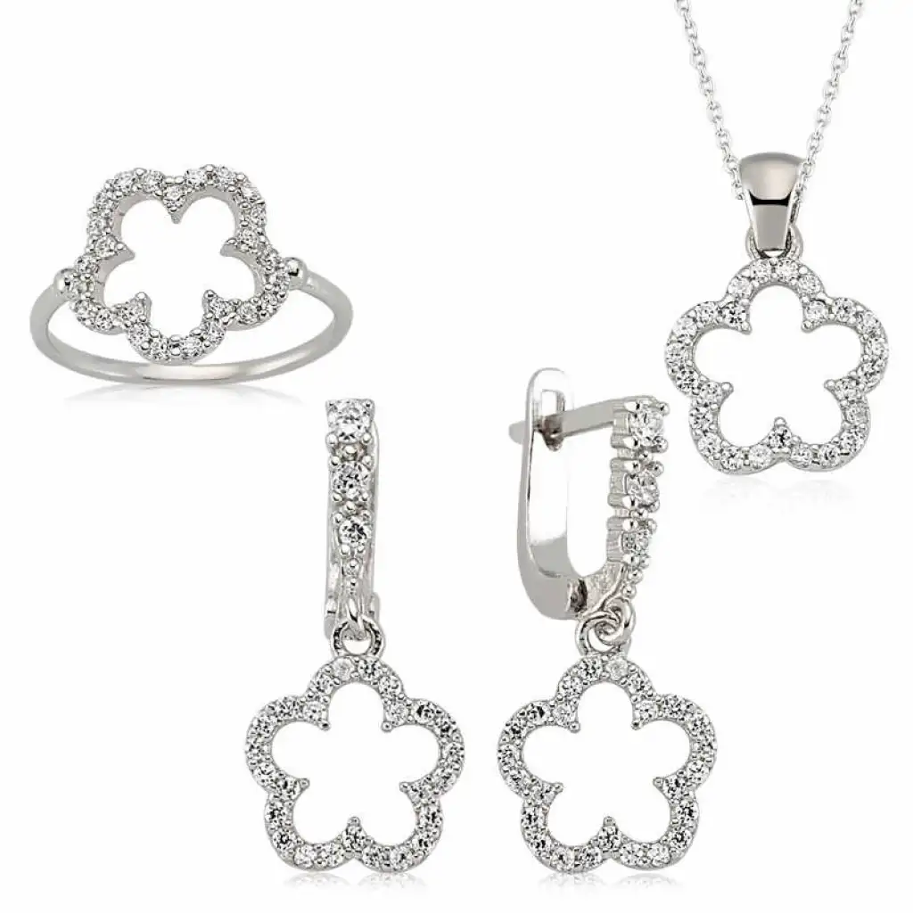 Sevdiklerinize duygularınızı ifade etmenin en özel ve zarif yolu O’na gönderebileceğiniz şık, rengarenk ve mis kokulu çiçeklerdir. Özel günlerde verilecek hediyeler arasında olan çiçek, bu kez gümüş set olarak tasarlandı... En kaliteli, en parlak, en ışıltılı taşlarla hazırlanmış gümüş çiçek bayan set sevgisini bir kez daha anlatmak isteyenleri, sen bir çiçeksin demek isteyenleri bekliyor. Bu özel tasarım çiçek bayan set 925 ayar gümüşten imal edilmiştir. Gümüş üzerine rodyum kaplama yapılmıştır. Rodyum kaplama yapılan gümüş bayan setler parlaklığını uzun süre muhafaza eder ve oksitlenmesi gecikir. Set üzerinde bulunan beyaz taşlar zirkondur. Zincir boyu ortalama 45 cm'dir. Tüm bayan gümüş setlerde olduğu gibi gümüş çiçek bayan set de el emeği ile üretilmiştir. Gümüş ve değerli taşlar nedeniyle belirtilen ortalama ürün ağırlığında ± %10 sapma olabilmektedir.