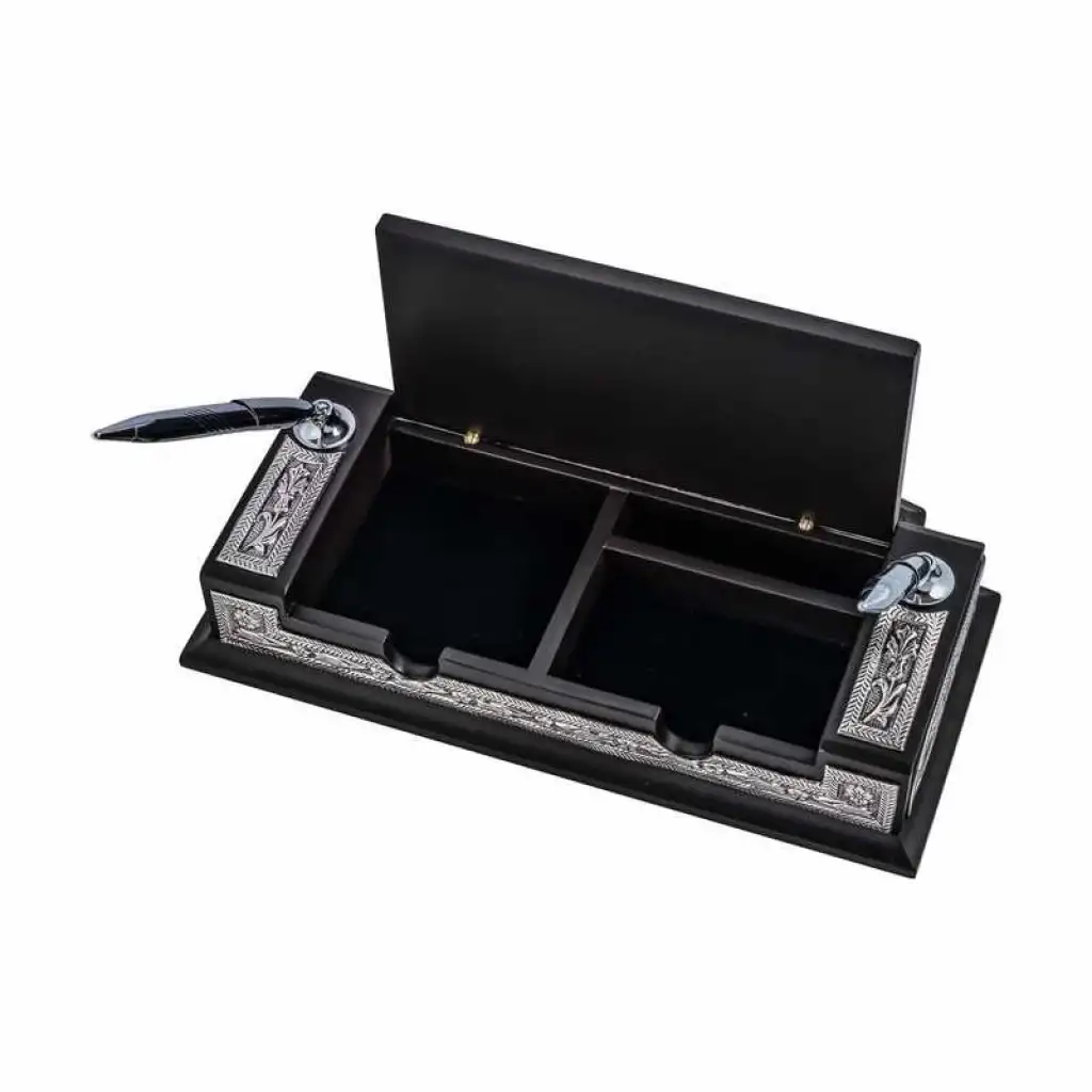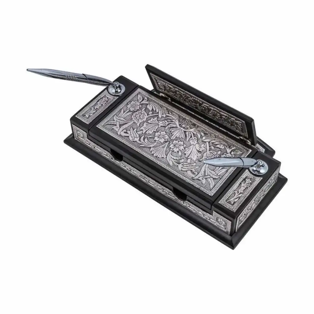 Gümüş aksesuarlar hediye olarak satın alınan değerli madenlerden biridir. Yeni iş, terfi gibi pek çok özel ve önemli günde hediye olarak alabileceğiniz masa üstü ürünler belleklerde iz bırakmanızı sağlar. Özellikle özgün tasarıma sahip gümüş çiçek desenli arapça besmele yazılı masa üstü kalemliği, sevdiklerinize hediye ederek sevdiklerinizi mutlu etmiş olursunuz. Uzun yıllar boyunca kullanabilecek gümüş ince işçilikle işlenerek tasarlanmış çiçek desenli Besmele masa üstü kalemlik, günün her anında kullanılabilecek en özel tasarımlardandır. Gümüş çiçek desenli besmele masa üstü kalemlik 925 ayar gümüşten imal edilmiştir. Kalemliğin ahşap kısmı kayın ağacından üretilmiş kontrplaktır. Ürün üzerinde 1024 Gr gümüş kullanılmıştır, ürün ağırlığında ± %10 sapma olabilmektedir.