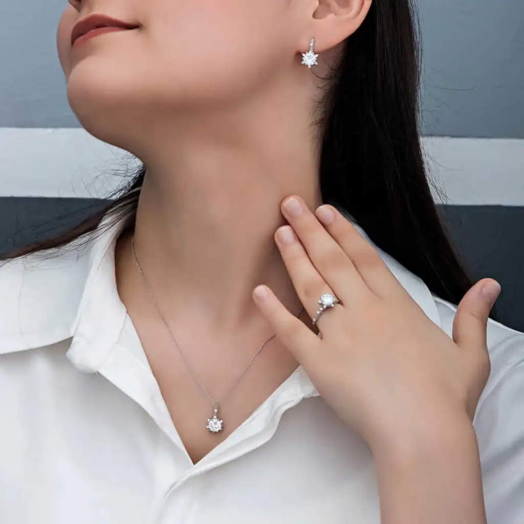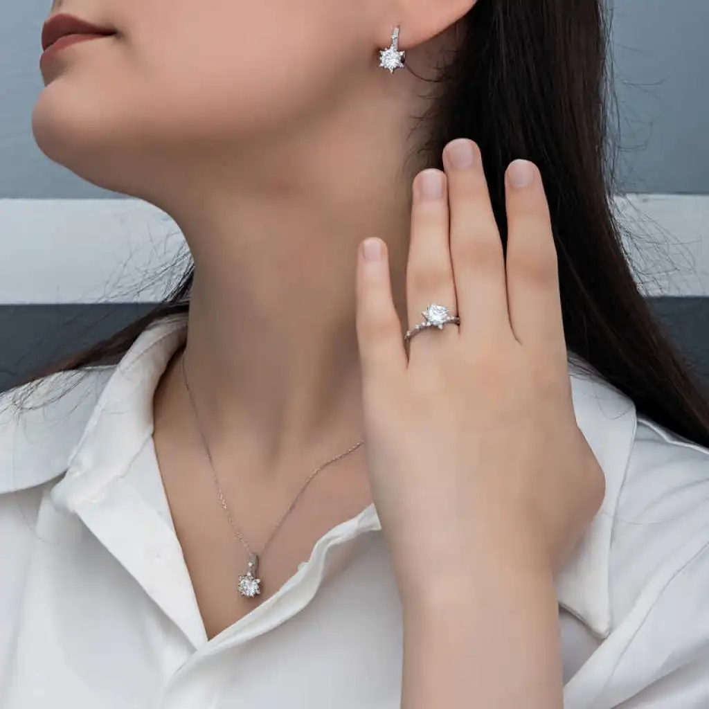 Özel günlerde kadınların tercihleri arasında ilk sıralarda yer alan setler pek çok kadının kurtarıcısıdır. Spor ve klasik her kıyafetle kombinleyebileceğiniz çiçek desenli set, çok uygun fiyatla karşınızda. Zarif çiçek motifi üzerine işlenen küçük beyaz zirkon taşlarla desteklenmiş bu modelle şıklığınızı tamamlayabilirsiniz. Bu set modeli 925 ayar gümüşten imal edilmiştir. Gümüş üzerine rodyum kaplama yapılmıştır. Rodyum kaplama yapılan gümüş set modelleri parlaklığını uzun süre muhafaza eder ve oksitlenmesi gecikir. Tüm gümüş setlerde olduğu gibi gümüş çiçek desenli kadın set modeli de tamamen el emeği ile üretilmiştir. Gümüş ve değerli taşlar nedeniyle belirtilen ortalama ürün ağırlığında ± %10 sapma olabilmektedir.