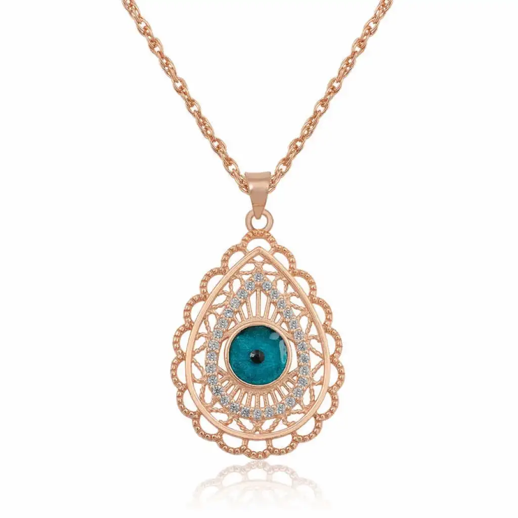 Günün her anında size eşlik edecek ve kombinlerinizi tamamlayabileceğiniz damla nazarlı gümüş kolye, şıklığınıza şıklık katacak bir aksesuar olacak. Bu şık kolye; doğum günü hediyesi, sevgililer günü veya özel günlerde tercih edilebilecek mükemmel bir seçenektir. Kolye; 925 ayar gümüşten imal edilmiştir. Üzerindeki taşlar zirkondur. Gümüş üzerine rose kaplama yapılmıştır. Rose kaplama yapılan ürünler gümüşe pembe bakır rengi verir. Diğer kolyelerde olduğu gibi gümüş oval nazar kolye de el emeği ile üretilmiştir. Gümüş ve değerli taşlar nedeniyle belirtilen ortalama ürün ağırlığında ± %10 sapma olabilmektedir.
