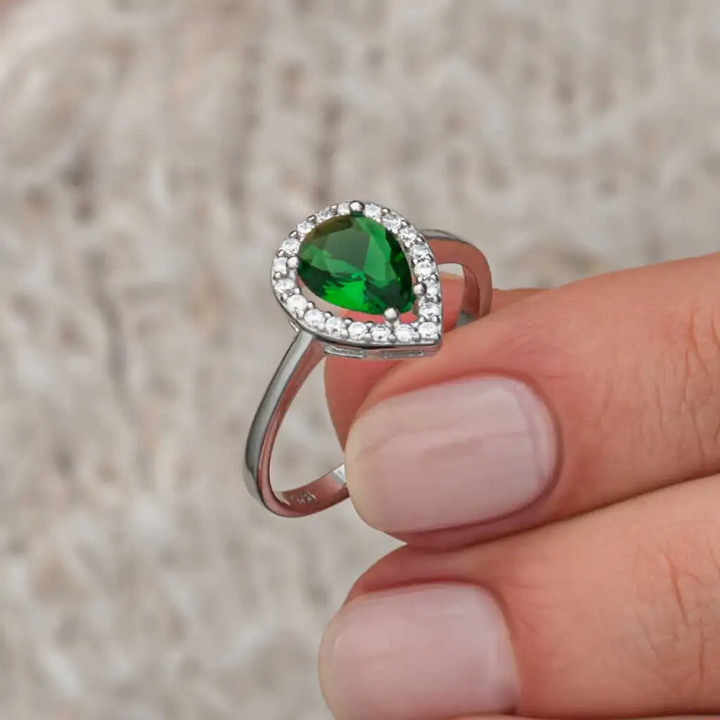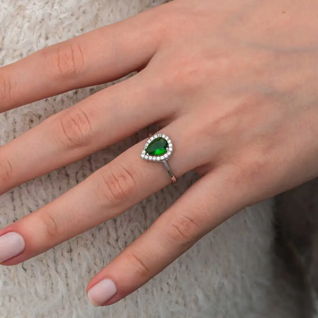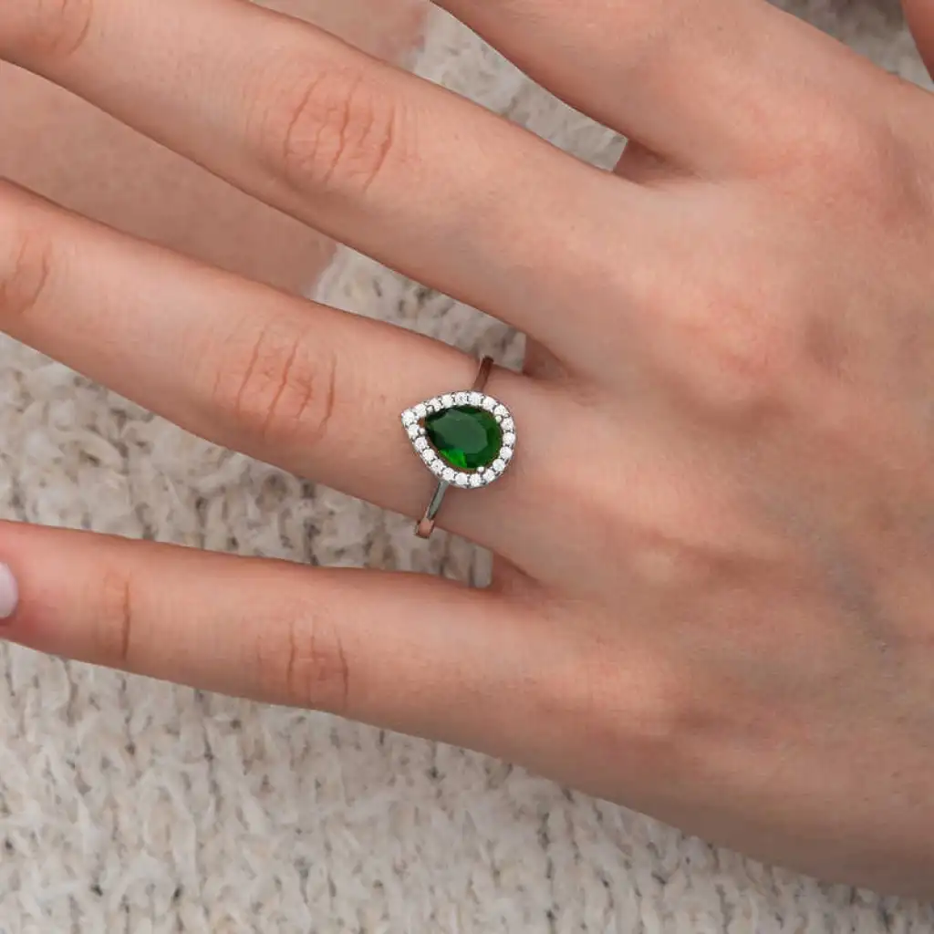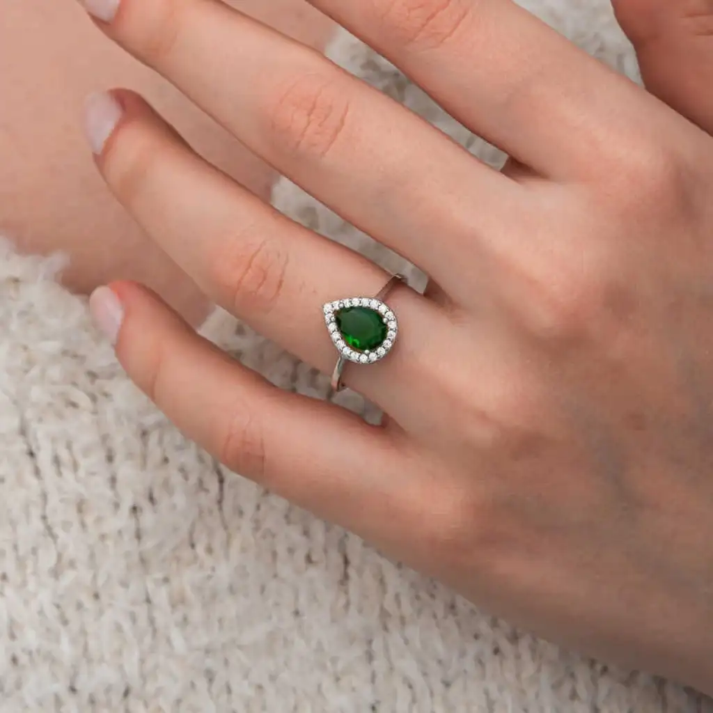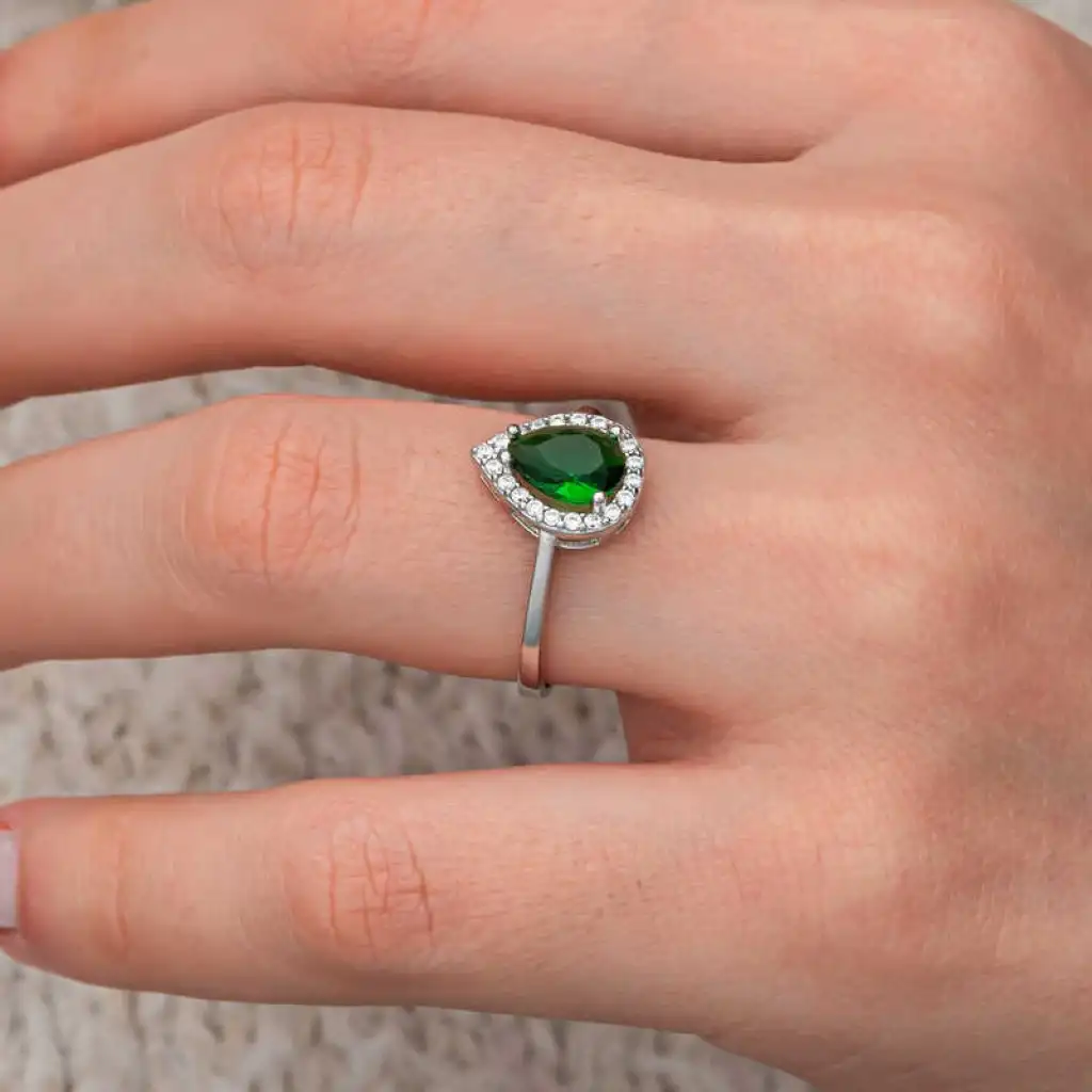 Gümüş Damla Zümrüt Taşlı Kadın Yüzük