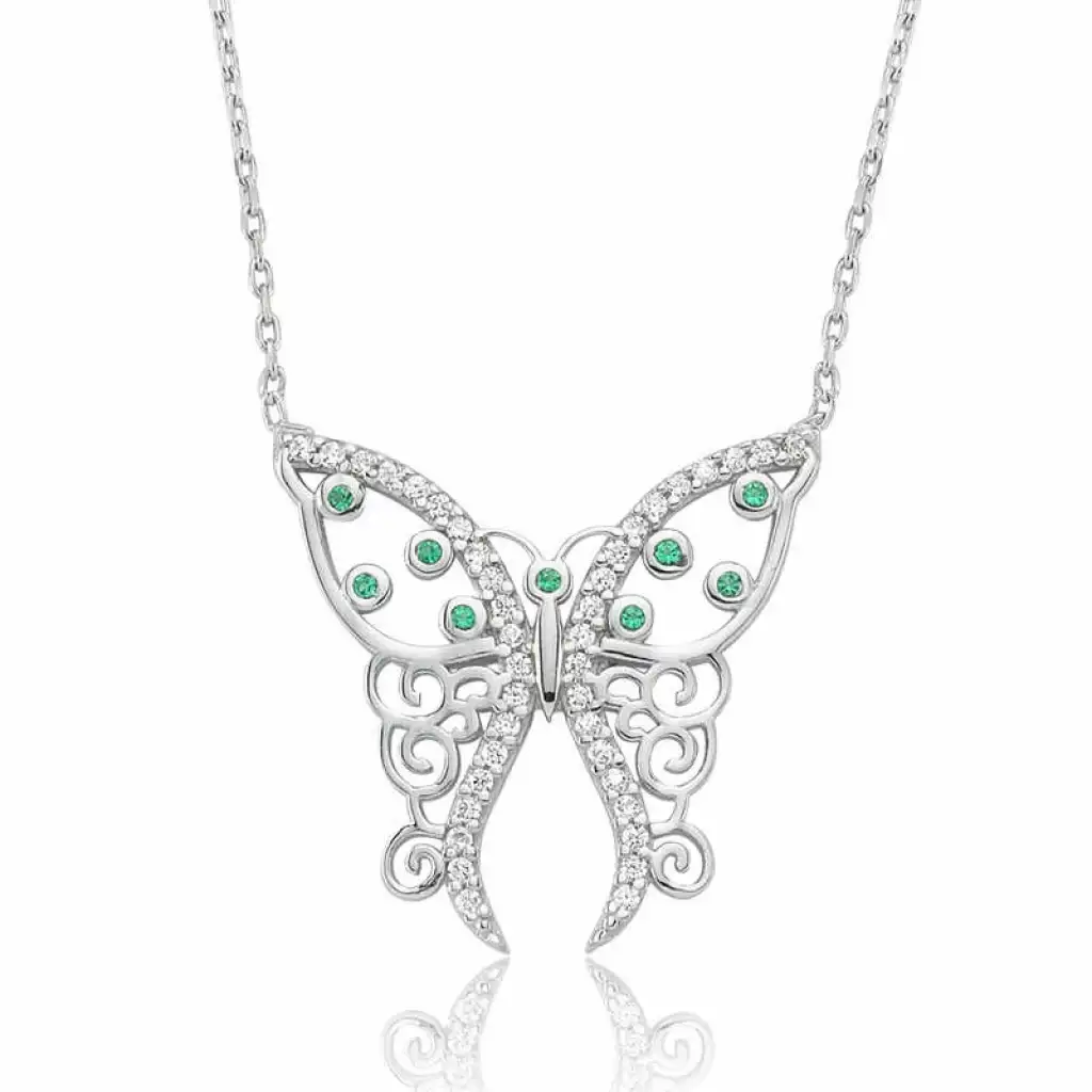 Özgürlüğü masumiyeti ve saflığı simgeleyen kelebekler, tertemiz sevginin ve aşkın ifadesidir. Sizin olduğu kadar sevdiklerinizin de keyifle takacağı yeşil kelebek bayan kolye en güzel hediyelerden biri olacaktır. Kolye 925 ayar gümüşten imal edilmiştir. Gümüş üzerine rodyum kaplama yapılmıştır. Rodyum kaplama yapılan gümüş bayan kolyeler parlaklığını uzun süre muhafaza eder, gümüşü beyaz altın rengine dönüştürür ve oksitlenmeyi geciktirir. Gümüş olan zincir boyu ortalama 45 cm'dir. Tüm gümüş bayan kolyelerde olduğu gibi gümüş desenli kelebek bayan kolye modeli de el emeği ile üretilmiştir. Gümüş ve değerli taşlar nedeniyle belirtilen ortalama ürün ağırlığında ± %10 sapma olabilmektedir.
