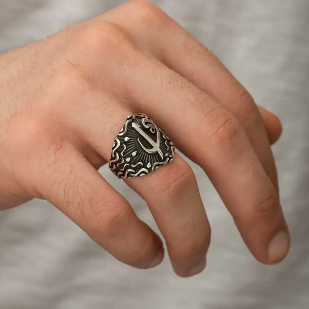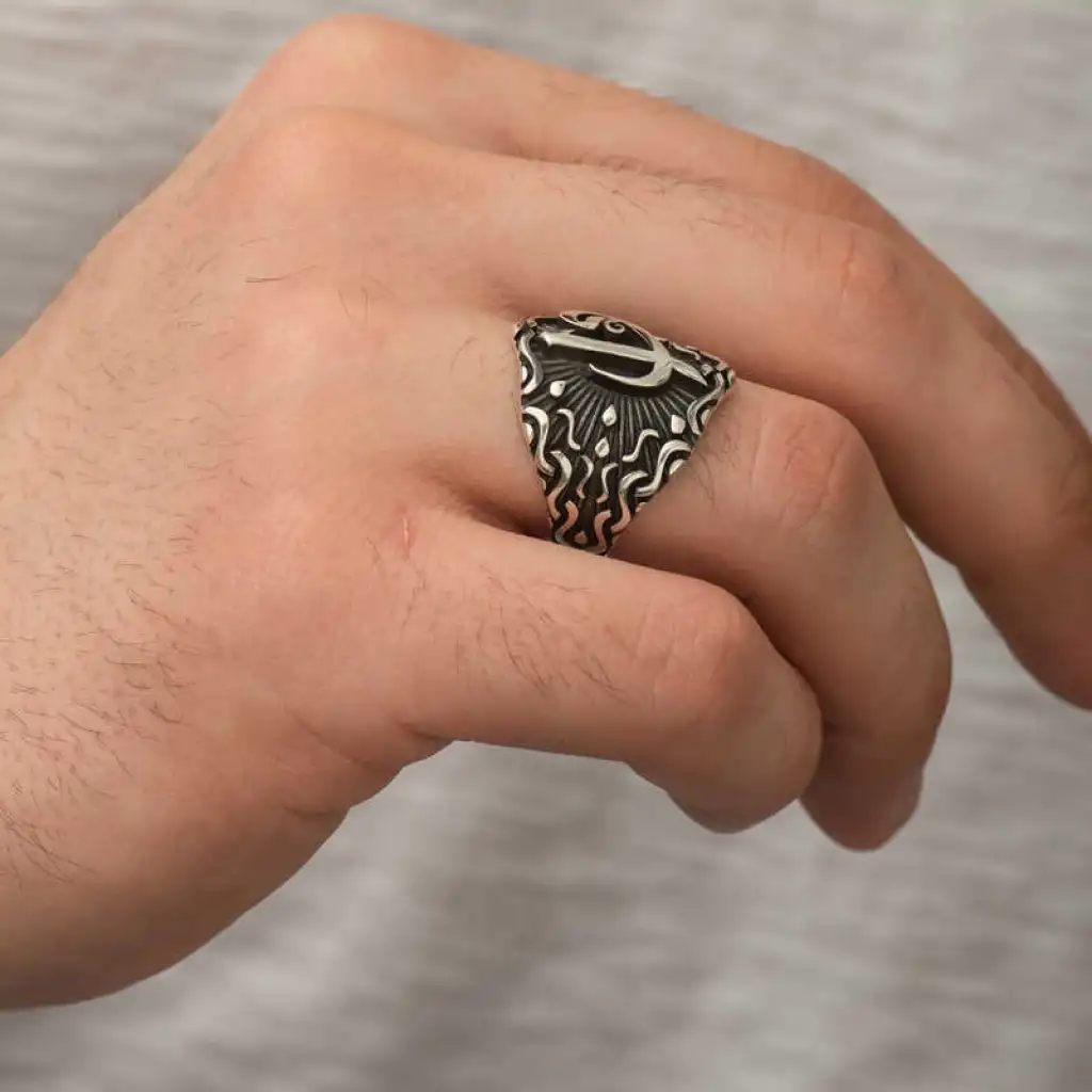 Her harfin sembolik bir anlamı vardır, tıpkı sayılar gibi... Allah'ın adı elif ile başladığı için diğer harfler gibi elif harfine soldan bir harf eklenemez. Allah'ın bir ve tek olduğunu simgelemektedir. Vav harfi ise anne karnında cenin pozisyonundaki bir kulu ve secdeye varan edepli bir kul anlamına gelir. Bu iki harf ve anlam beraber kullanılır. Vav gibi olmalı ilk yaradana bükülmeli, kulluk etmeyi bilmeli. Başlangıcımız vav gibi olmalı ilerleyişimiz elif gibi olmalı. Bu derin ve güzel anlamlardan yola çıkarak tasarladığımız elif vav erkek yüzüğü; kendinize ya da sevdiklerinize doğum gününde, babalar gününde ve özel günlerde tercih edebilirsiniz. Bu şık yüzük 925 ayar gümüşten imal edilmiştir. Gümüş üzerine oksit kaplama yapılmıştır. Oksit kaplama yapılan yüzükler parlaklığını uzun süre muhafaza eder. Tüm erkek yüzüklerde olduğu gibi gümüş elif vav erkek yüzük de el emeği ile üretilmiştir. Gümüş ve değerli taşlar nedeniyle ürün ağırlığında ± %10 sapma olabilmektedir.