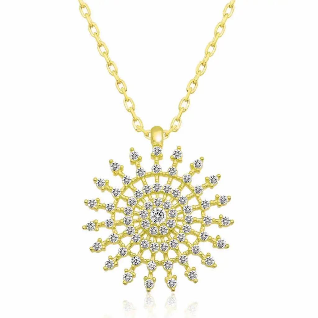 Güneş; ışığın, bilginin, iyiliğin, gücün ve yönetimin sembolüdür. Bu ışıl ışıl ve farklı tasarımıyla göz kamaştıran kolye; 925 ayar gümüşten imal edilmiştir. Gümüş üzerine gold kaplama yapılmıştır. Gold kaplama yapılan gümüş ürünler parlaklığını uzun süre muhafaza eder, oksitlenmesi gecikir. Gümüş beyaz taşlı güneş kadın kolye üzerinde bulunan taşlar zirkon'dur. Tüm gümüş kolyelerde olduğu gibi gümüş güneş kadın kolye de tamamı el emeği ile üretilmiştir. Gümüş ve değerli taşlar nedeniyle belirtilen ortalama ürün ağırlığında ± %10 sapma olabilmektedir.