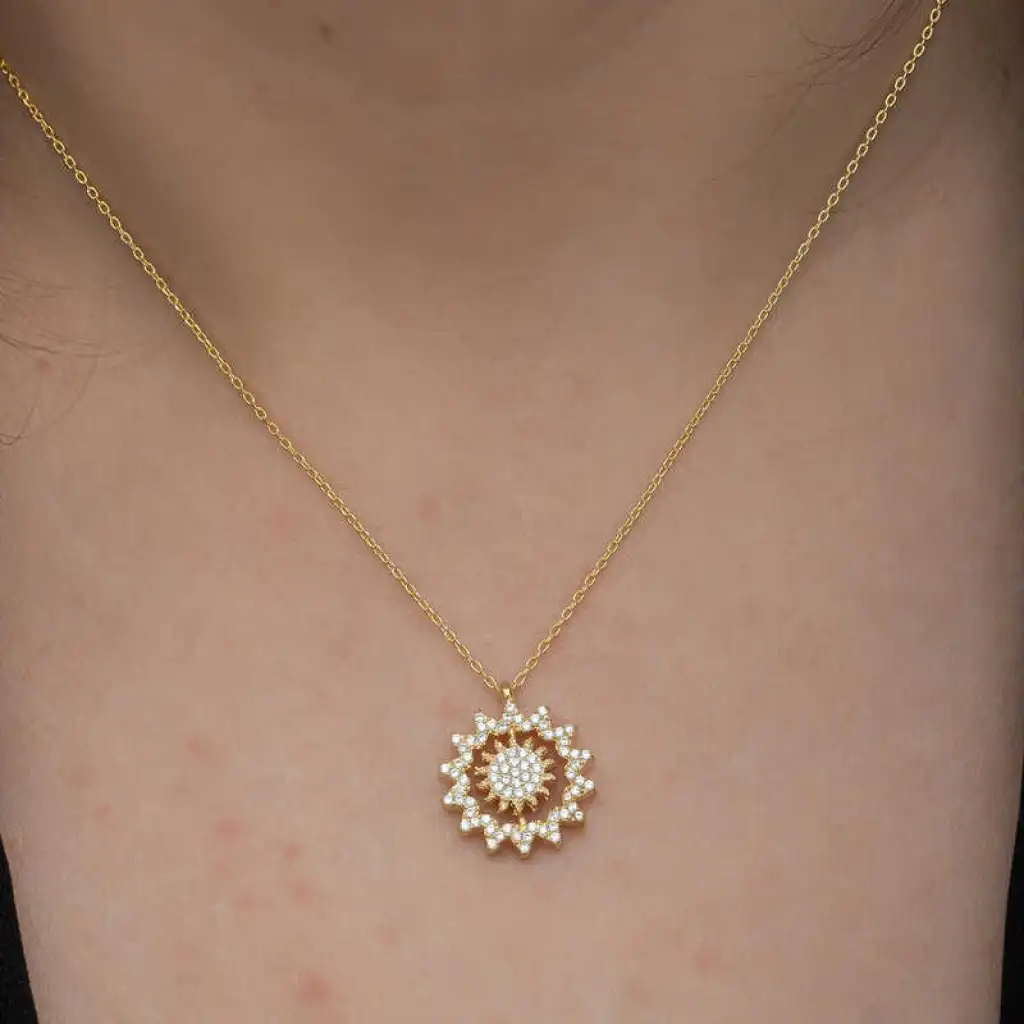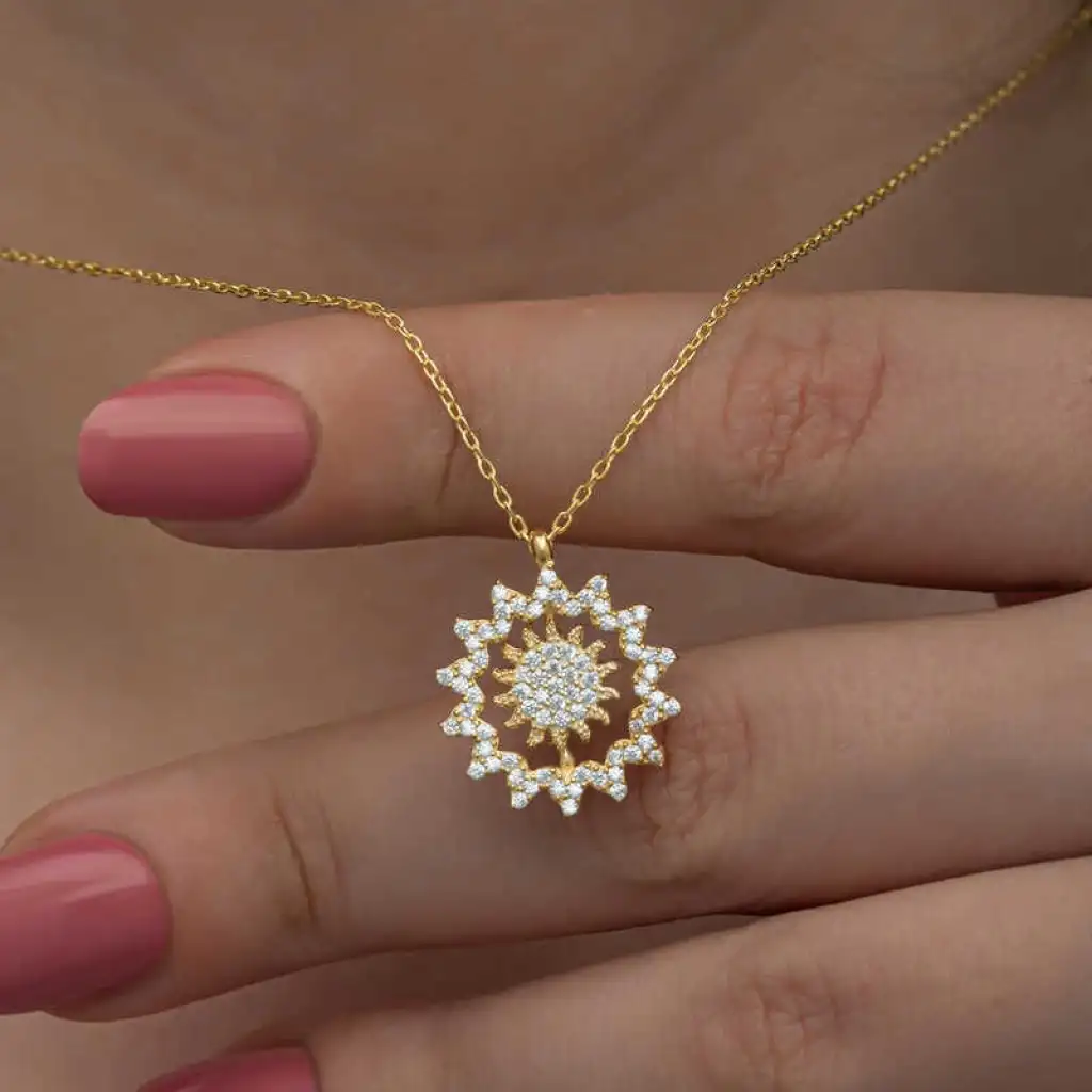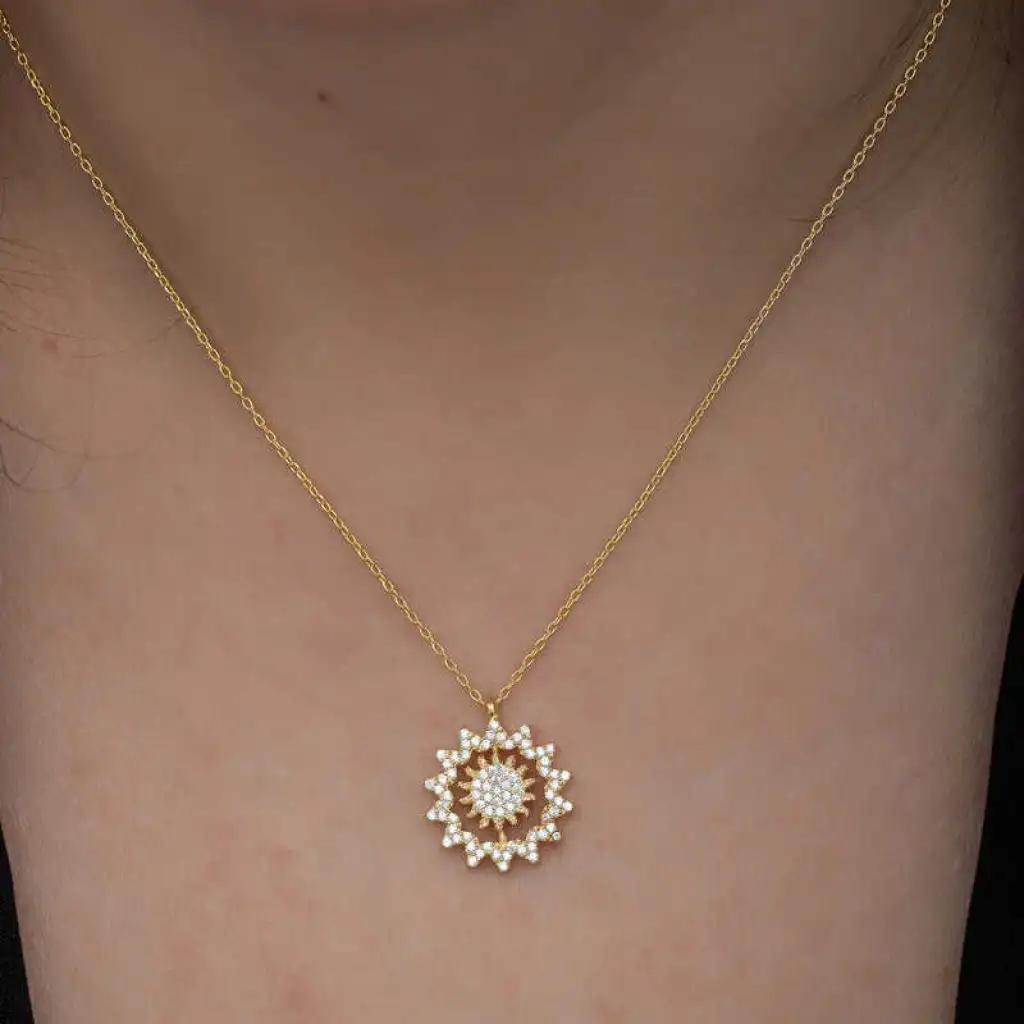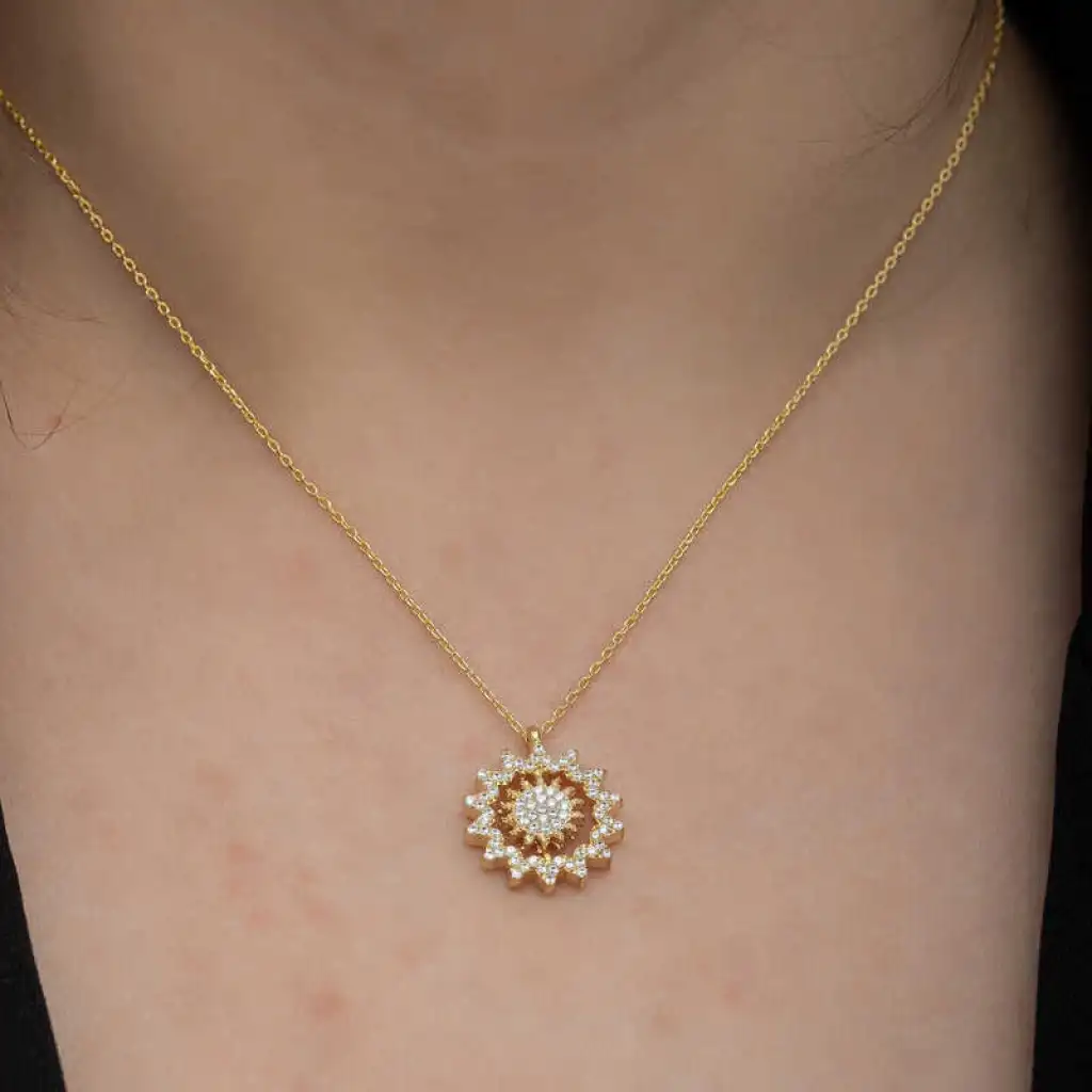 Güneş; ışığın, bilginin, iyiliğin, gücün ve yönetimin sembolüdür. Bu ışıl ışıl ve farklı tasarımıyla göz kamaştıran kolye; 925 ayar gümüşten imal edilmiştir. Gümüş üzerine gold kaplama yapılmıştır. Gold kaplama yapılan gümüş ürünler parlaklığını uzun süre muhafaza eder, oksitlenmesi gecikir. Gümüş beyaz taşlı güneş kadın kolye üzerinde bulunan taşlar zirkon'dur. Tüm gümüş kolyelerde olduğu gibi gümüş güneş kadın kolye de tamamı el emeği ile üretilmiştir. Gümüş ve değerli taşlar nedeniyle belirtilen ortalama ürün ağırlığında ± %10 sapma olabilmektedir.