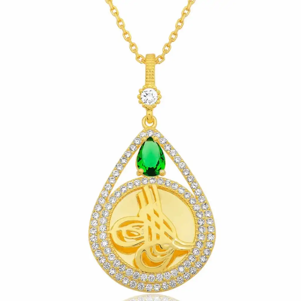 Gümüş Gold Kaplama Yeşil Taşlı Damla Tuğralı Kadın Kolye