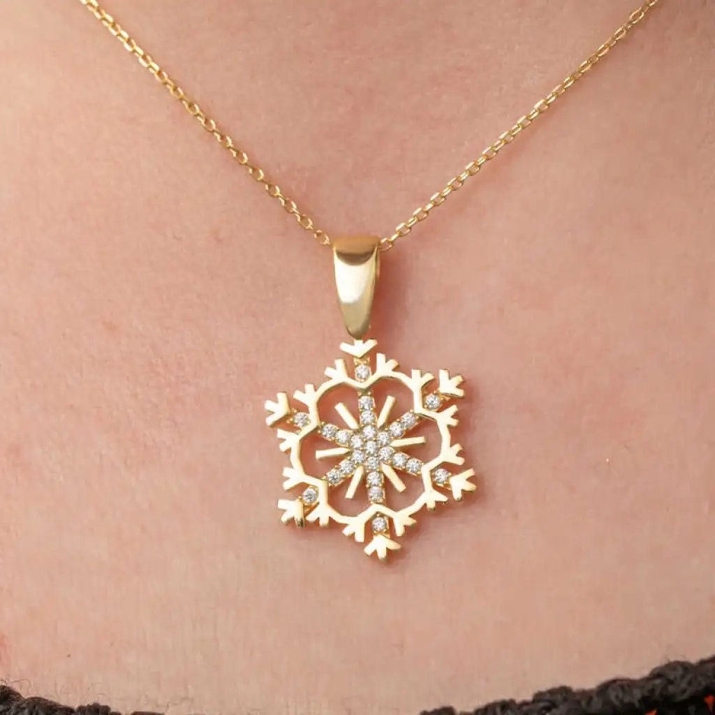 Kadınların ışıltısı, berraklığı kar tanesine benzetilip özel olarak tasarlanmıştır. Kar tanelerinin her birinin kadınlar gibi eşsiz ve ayrı kıymette olması onları özel kılan bir diğer özelliktir. Asilliği her dönemde dikkat çekmeyi başarmıştır. Bunun yanında insanların tıpkı kar taneleri gibi birbirlerine zarar vermeden de mutlu bir şekilde yaşayabileceklerini sembolize etmektedir. Bu şık kolye; doğum günü hediyesi, sevgililer günü hediyesi veya annelere hediye olarak özel günlerde tercih edilebilecek mükemmel bir seçenektir. Kolye, 925 ayar gümüşten imal edilmiştir. Gümüş üzerine gold kaplama yapılmıştır. Gold kaplama yapılan gümüş kadın kolye modelleri parlaklığını uzun süre muhafaza eder, oksitlenmesi gecikir. Zincir boyu ortalama 45 cm'dir. Tüm gümüş kadın kolye modellerinde olduğu gibi bu gümüş kar tanesi kadın kolye de tamamı el emeği ile üretilmiştir. Gümüş ve değerli taşlar nedeniyle belirtilen ortalama ürün ağırlığında ± %10 sapma olabilmektedir.