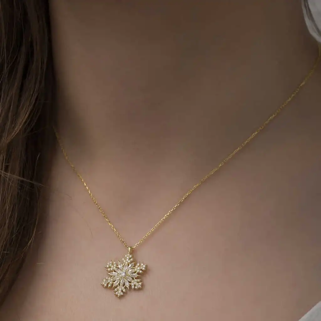 Kadınların ışıltısı, berraklığı kar tanesine benzetilip özel olarak tasarlanmıştır. Kar tanelerinin her birinin bayanlar gibi eşsiz ve ayrı kıymette olması onları özel kılan bir diğer özelliktir. Asilliği her dönemde dikkat çekmeyi başarmıştır. Bunun yanında insanların tıpkı kar taneleri gibi birbirlerine zarar vermeden de mutlu bir şekilde yaşayabileceklerini sembolize etmektedir. Bu şık kolye; doğum günü hediyesi, sevgililer günü hediyesi veya annelere hediye olarak özel günlerde tercih edilebilecek mükemmel bir seçenektir. Kolye, 925 ayar gümüşten imal edilmiştir. Gümüş üzerine altın kaplama yapılmıştır. Altın kaplama yapılan ürünler parlaklığını uzun süre muhafaza eder ve oksitlenmesi gecikir. Tüm gümüş bayan kolyelerde olduğu gibi bu gümüş gold kar tanesi bayan kolye de tamamı el emeği ile üretilmiştir. Gümüş ve değerli taşlar nedeniyle belirtilen ortalama ürün ağırlığında ± %10 sapma olabilmektedir.